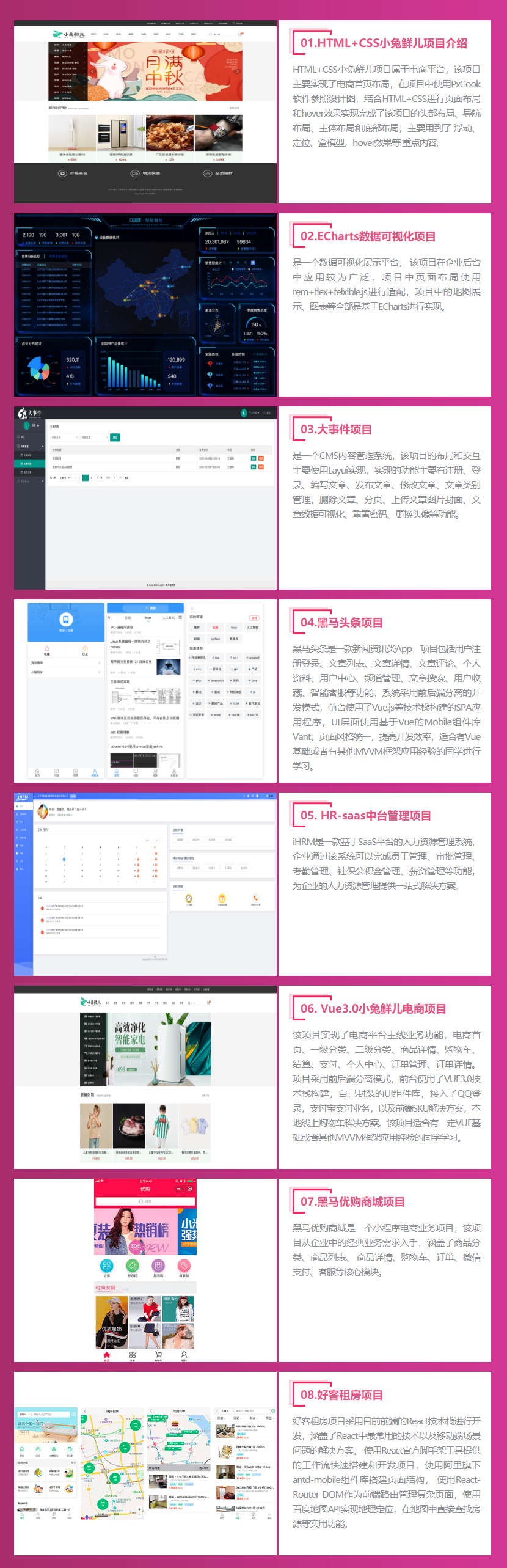 随着移动互联网的深入发展,多屏互动和多端兼容友好的界面成为目前系统重要的需求,让前端开发工程师一跃成为目前市场紧俏的人才。 本课程内容包含目前的Vue、React前端框架,把全栈工程师要掌握的前端技术、Node.js相关后台技术、HTML5移动方向开发技术做了系统整合, 致力于培养中高级前端工程师。