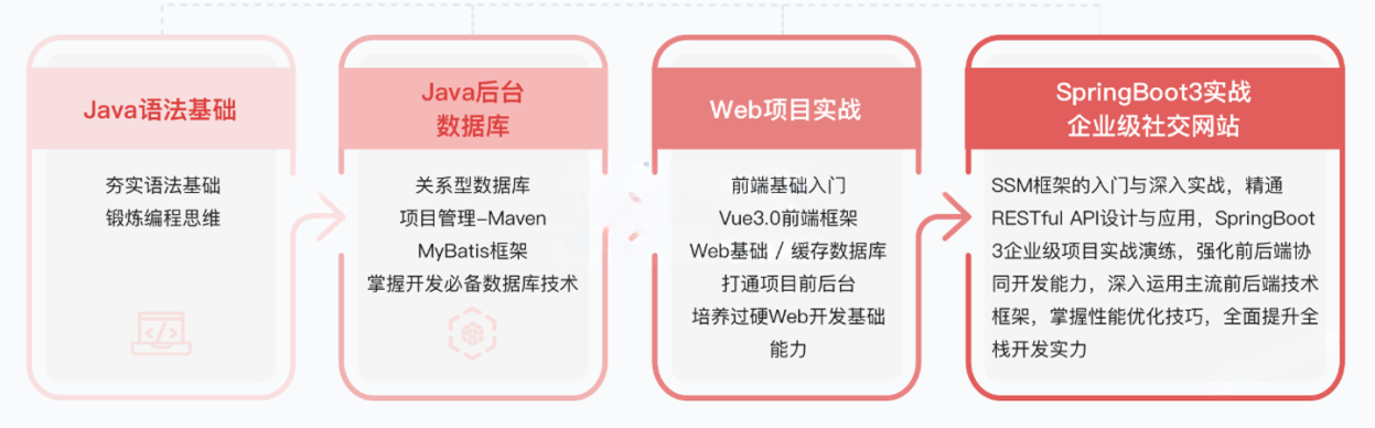 2024年的重磅更新,超过百小时的内容豪华升级。从零基础到高级实战,不断迭代,内容涵盖Java语法基础、Java后台、数据库、Web项目实战、SpringBoot3实战、企业级社交网站、主流分布式架构与微服务、面试与就业指导、Java源码解析及性能调优。技术深度广度双向进阶,助你跨过技术能力分水岭,迈上更高职业起点。