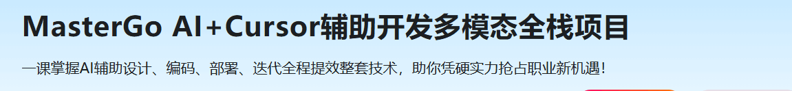 AI 正在重塑开发范式,不会用 AI 全栈工具开发与提效的开发者,将面临职业危机。课程带你从0到1打造一款具备AI 聊天、AI 写作、AI 绘图等多模态全栈项目,借助 MasterGo AI(设计提效)与 Cursor(代码生成)AI工具链,快速提升从设计,编码到部署等开发效率。无论前端开发者,后端开发者,拥有全栈开发大模型业务的项目经验及全链路AI提效技能,都能让职业竞争力倍增,摆脱内卷,成为企业抢手的开发人才。