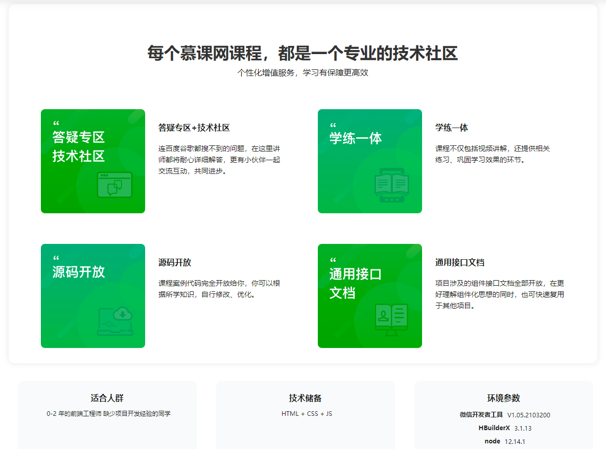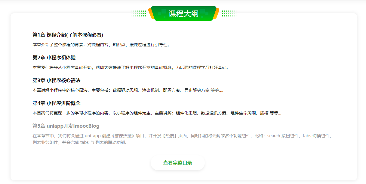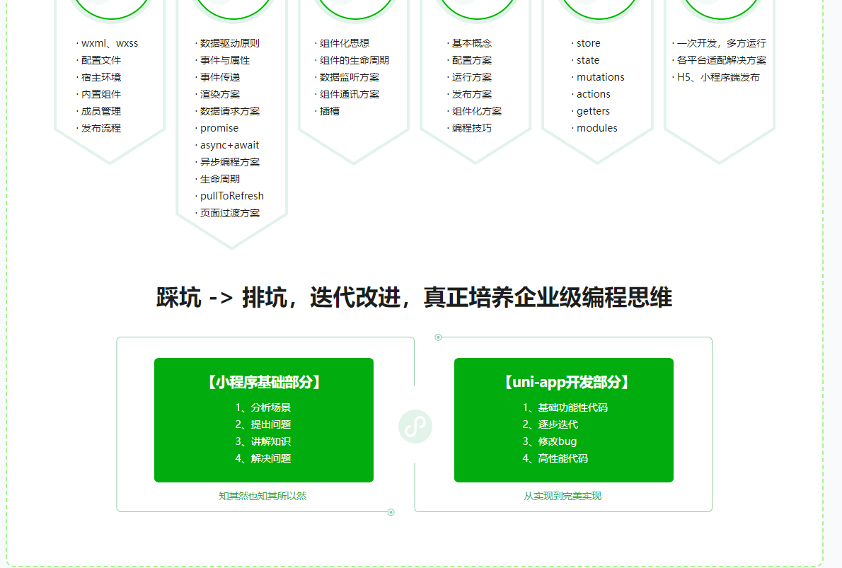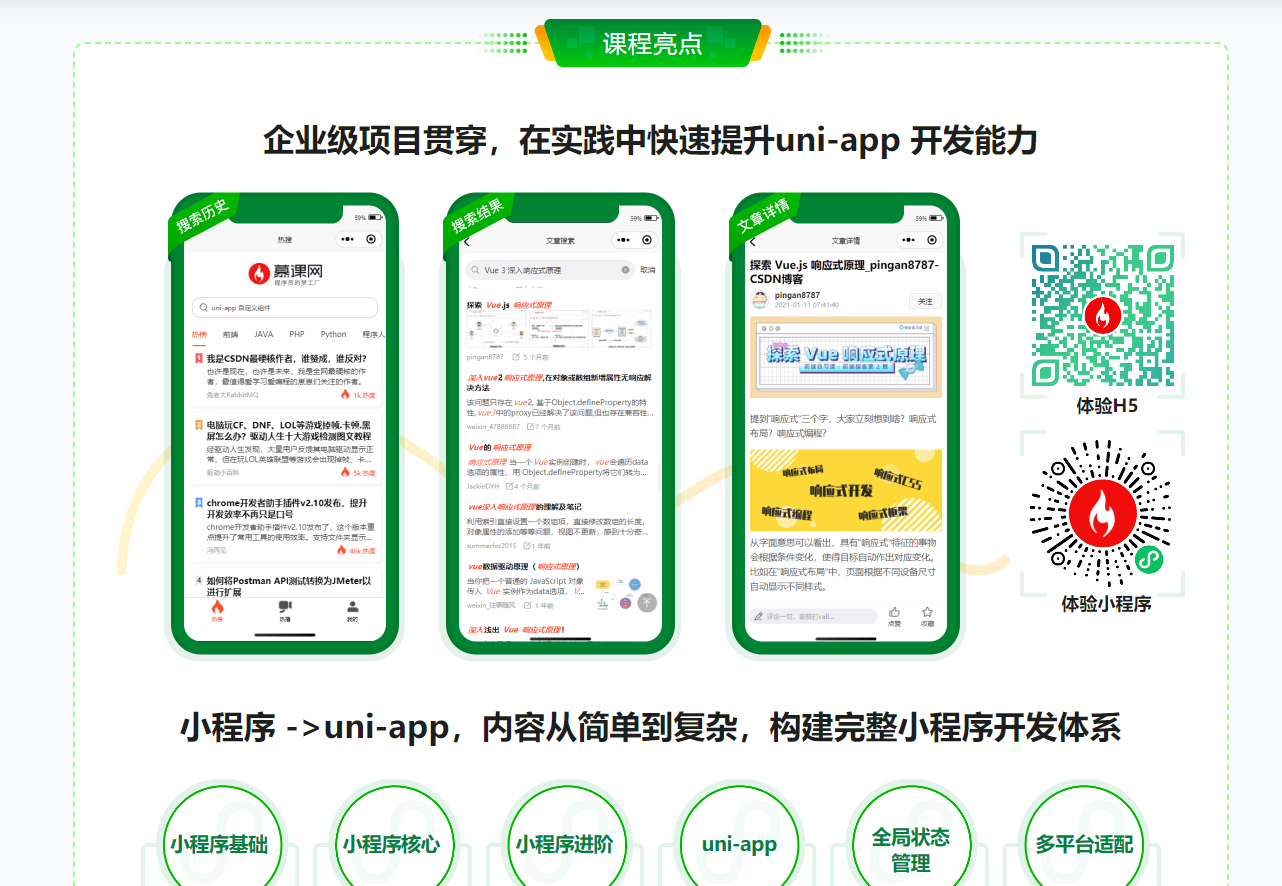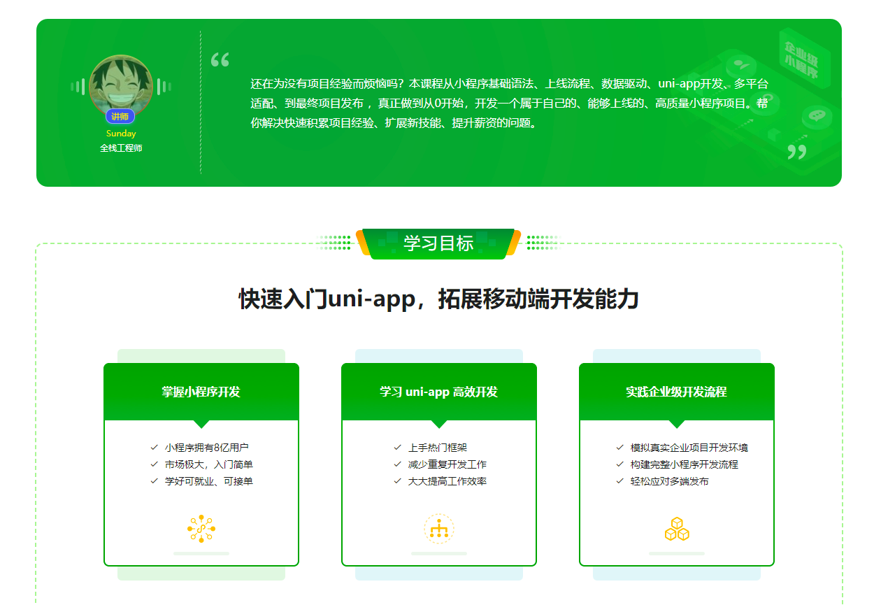 还在为没有项目经验而烦恼吗?本课程从小程序基础语法、上线流程、数据驱动、uni-app开发、多平台适配、到最终项目发布 ,真正做到从0开始,开发一个属于自己的、能够上线的、高质量小程序项目。帮你解决快速积累项目经验、扩展新技能、提升薪资的问题。