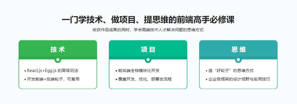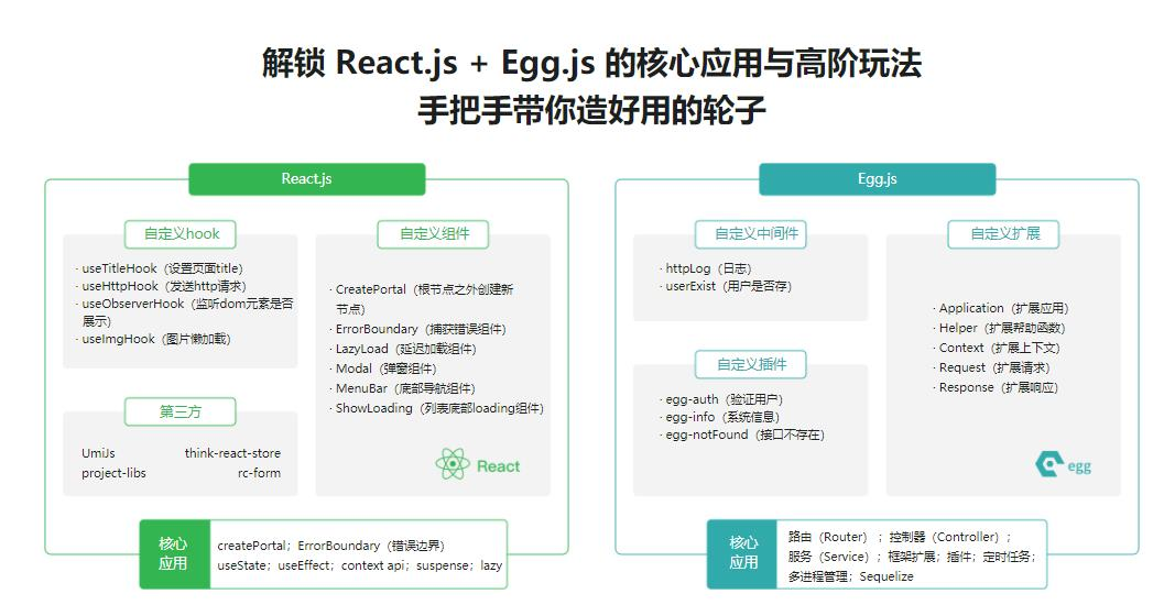 本课程将带你在解锁 React.JS 、 React Hook 以及 EggEgg.js 的高阶玩法的同时,完成轮子的构建过程,再用造好的轮子开发一个全栈项目。你将在掌握全栈技能的同时,获取如何拆解复杂业务、如何造好轮子、如何优化性能等诸多“高手”必备的实用技能。