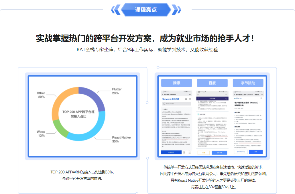 本章节主要讲解全屏幕的适配与优化,并对全面屏的特点及存在的问题做出分析,同时教大家如何适配iPhone X,华为,小米、三星等全面屏与凹凸屏手机。另外,会讲解react-navigation在全面屏凹凸屏上的应用,章节最后会教大家如何去自定义一个容器组件。…