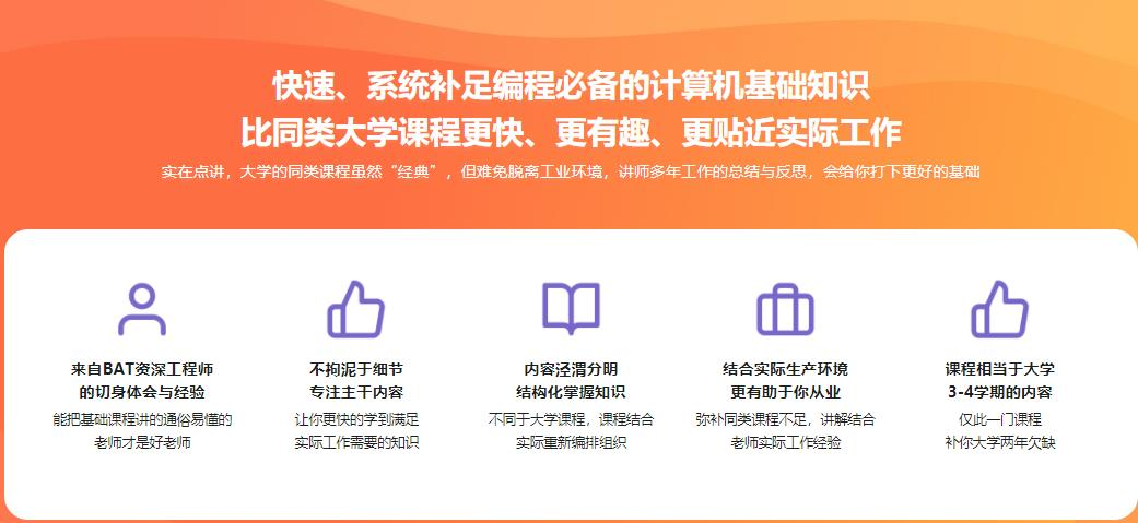 计算机基础方面的知识。对于非科班出身的同学来讲,一直是心中的痛,而对于科班出身的同学,在工作之后,也意识到自身所学知识的不足。讲师结合自己多年工作经验,总结出了这套更适合程序员的计算机基础知识课程,带你更快的补足编程必备基础知识。