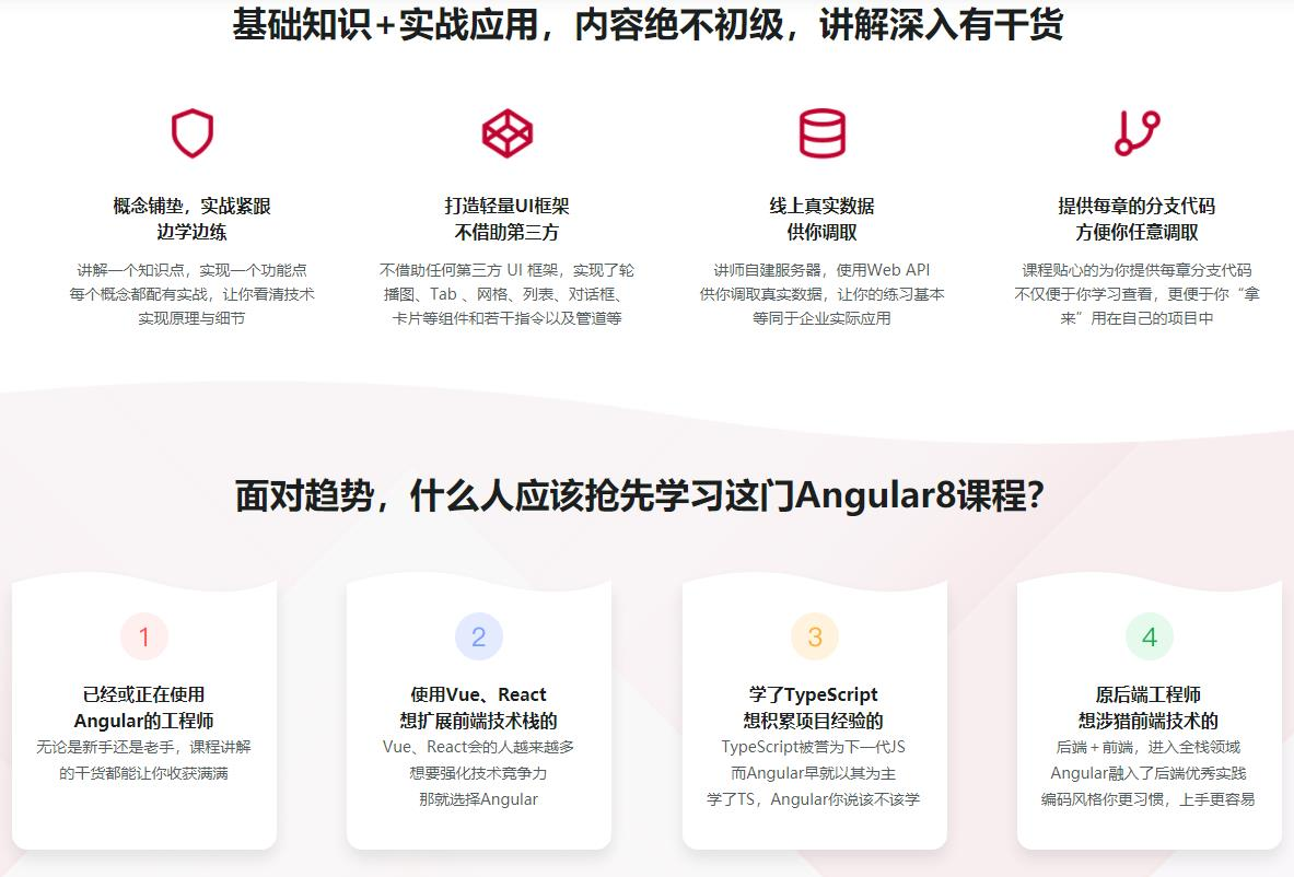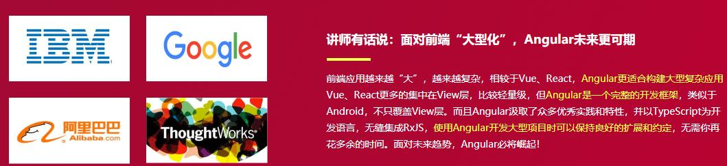 火爆的项目,酣畅的实战,带你收获满满的干货,你会发现,其实Angular并不是像传闻说的那样“很难”,相反,你会发现Angular的很多思想是非常领先的,课程会从基础开始,为你呈现一个完整的Angular 学习路径。