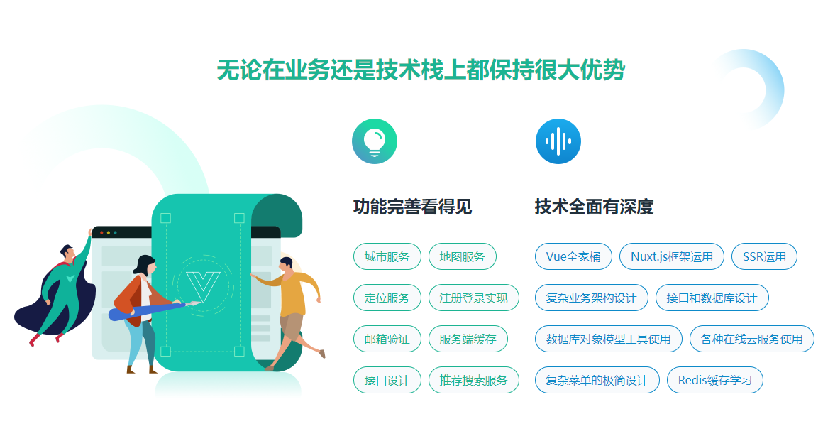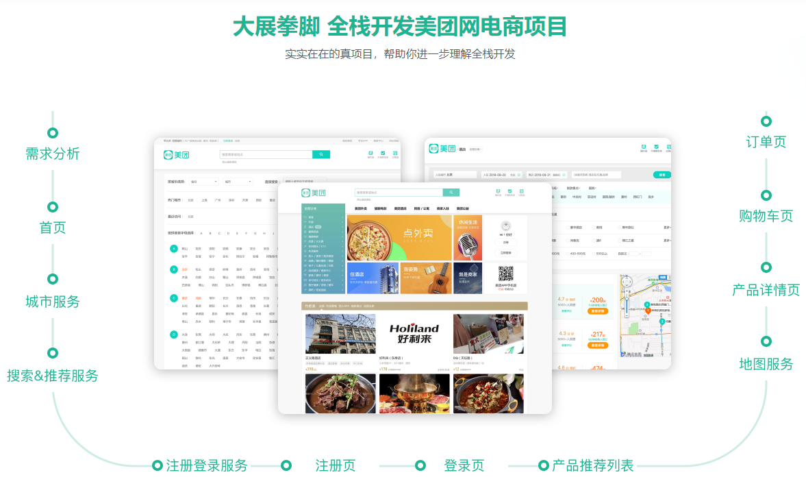 这是一门前端全栈课程,课程中采用了许多新的技术,结合包括Vue2.5、Koa2、MongoDB、Redis等多种前后端技术完成了美团网的开发。课程从新技术的基础讲解入手,通过细致的项目开发过程,带你开发一个美团网PC网页版,同学们通过这门课程的学习可以掌握更全面的项目架构,迅速提升,达到高级工程师的水平。