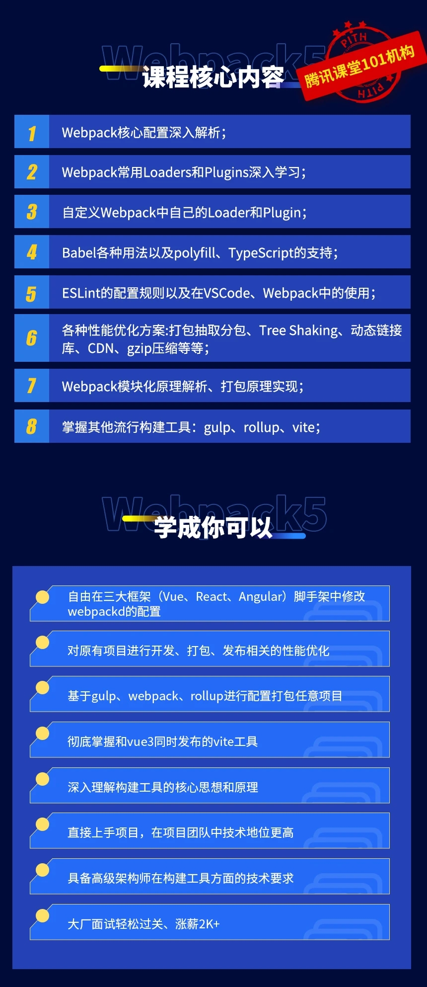 课程的目标是帮助大家从零开始学习webpack,到webpack各种核心配置、高级进阶配置,到webpack模块化打包原理等整个webpack体系的内容。以及掌握gulp、rollup、vite这3个流行构建工具 |