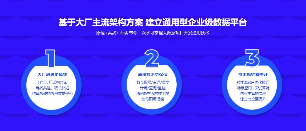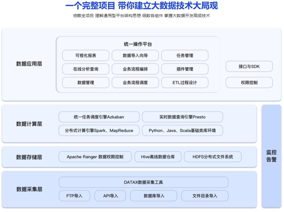 从企业需求入手,构建集数据采集、数据存储、数据处理与分析、BI应用、权限管理、系统监控等于一体的大数据应用平台,帮助我们快速掌握大数据平台开发技术,迅速建立大数据技术的宏观的认识。