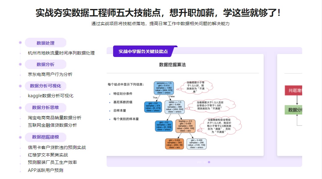 仅掌握基础的数据分析技能,早已无法满足高薪岗位的需求,所以进阶成为中高级数据工程师势在必行。本课程通过一系列企业级数据分析项目实战,带你夯实数据分析必备技能、拓展数据分析思维、学习数据分析算法应用,让你快速掌握中级数据工程师必备的核心技能,叩开大厂之门!