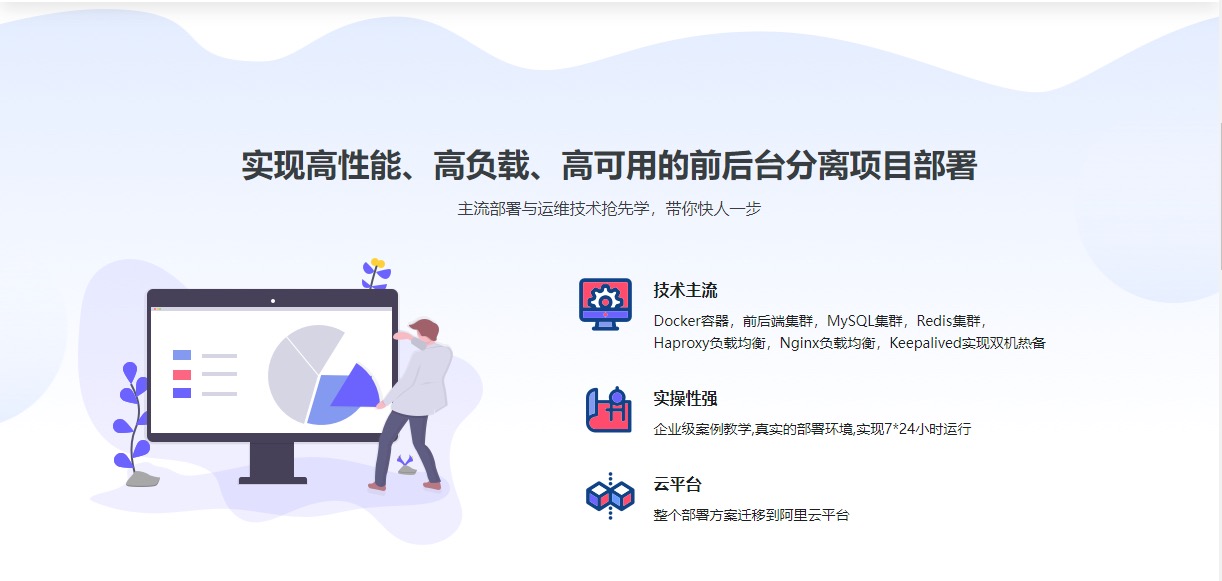 本课程把一个真实企业级前后端分离项目部署在Linux环境中,利用Docker虚拟机的容器技术,采用分布式集群部署,将项目转换成为高性能、高负载、高可用的部署方案。包括Docker集群、MySQL集群、Redis集群、负载均衡、双机热备等等。