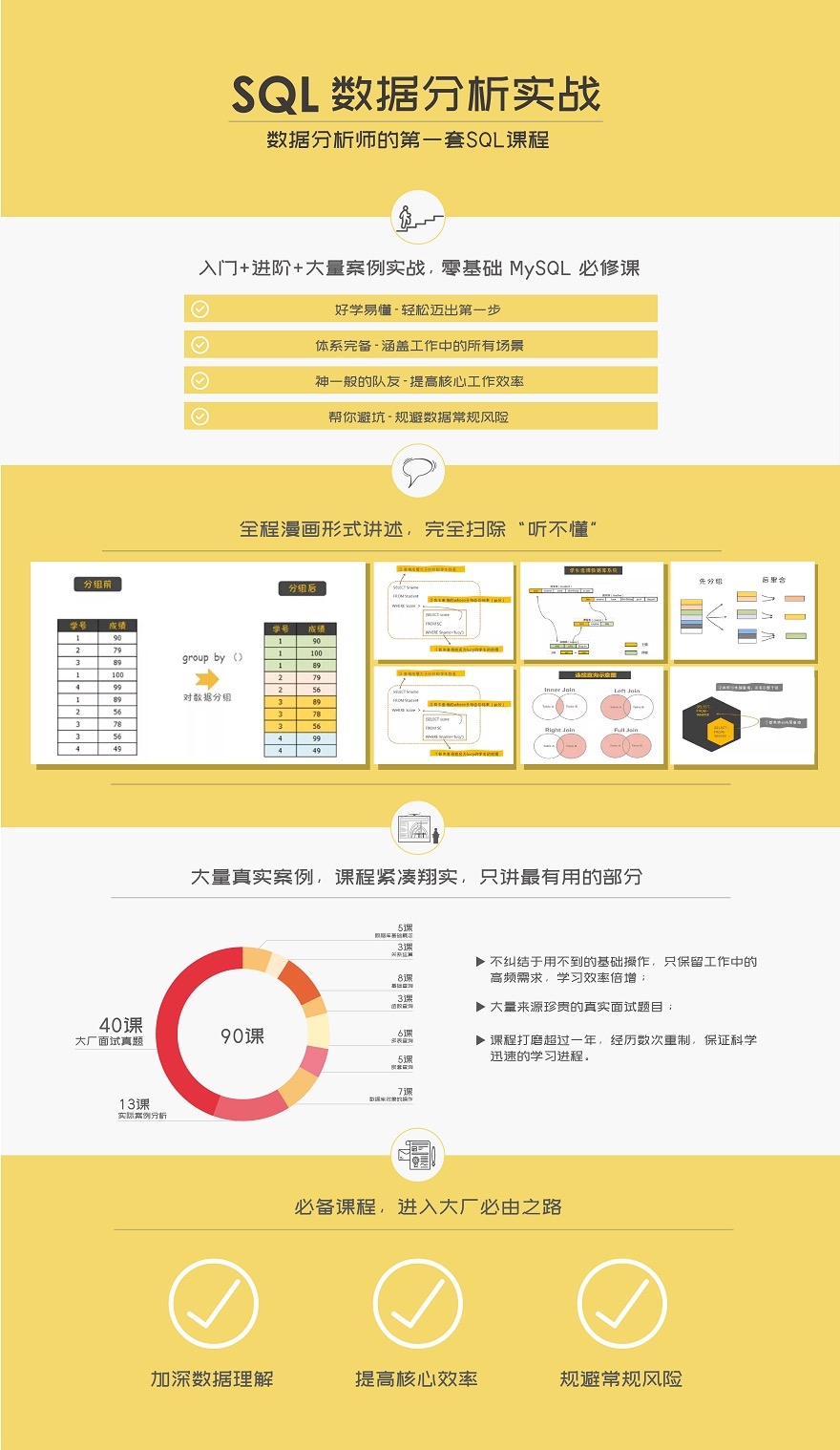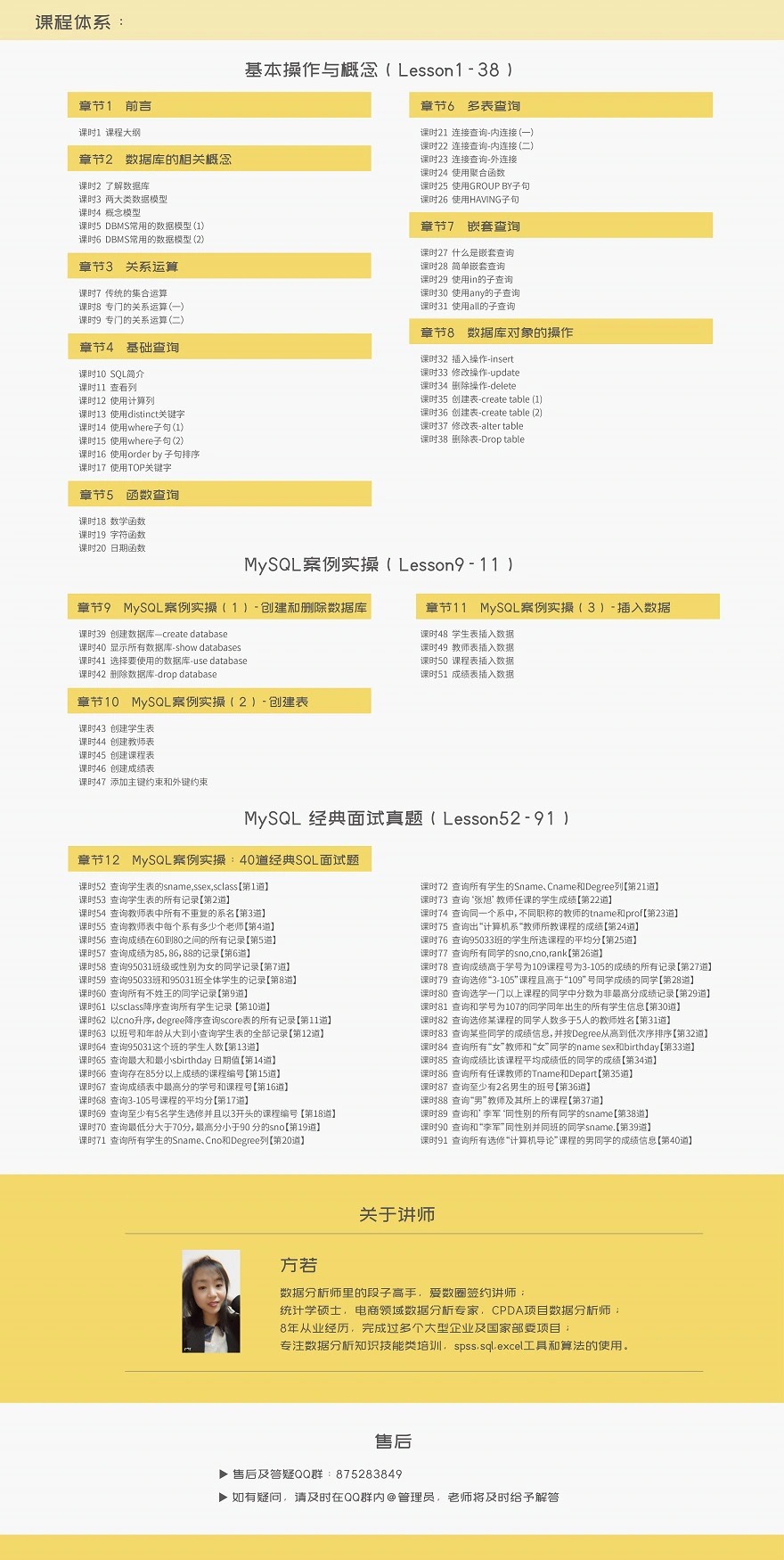 资源介绍 更新记录 有疑问?请点击复制链接咨询! 适用人群 针对SQL零基础,想要学习SQL,或者系统学习SQL的学员 课程概述 本课程是图文教程+视频教程 星课it » 漫画SQL——mysql 必修课 常见问题FAQ 视频课程的格式是什么? 视频不加密,网盘在线学习,课程免费更新,持续更新 购买后怎么如何下载资源? 点击下载按钮,会跳转到百度网盘链接或者阿里云盘链接【链接如失效点击网站右侧联系客服】 有些资源没更新完结怎么办? 本站资源包更新至完结,后续可以点击链接获取 有问题不懂想咨询怎么办? 点击右侧微信客服发起咨询。 2024-03-03Hi,初次和大家见面了,请多关照!