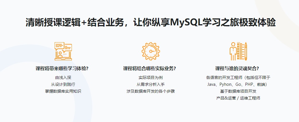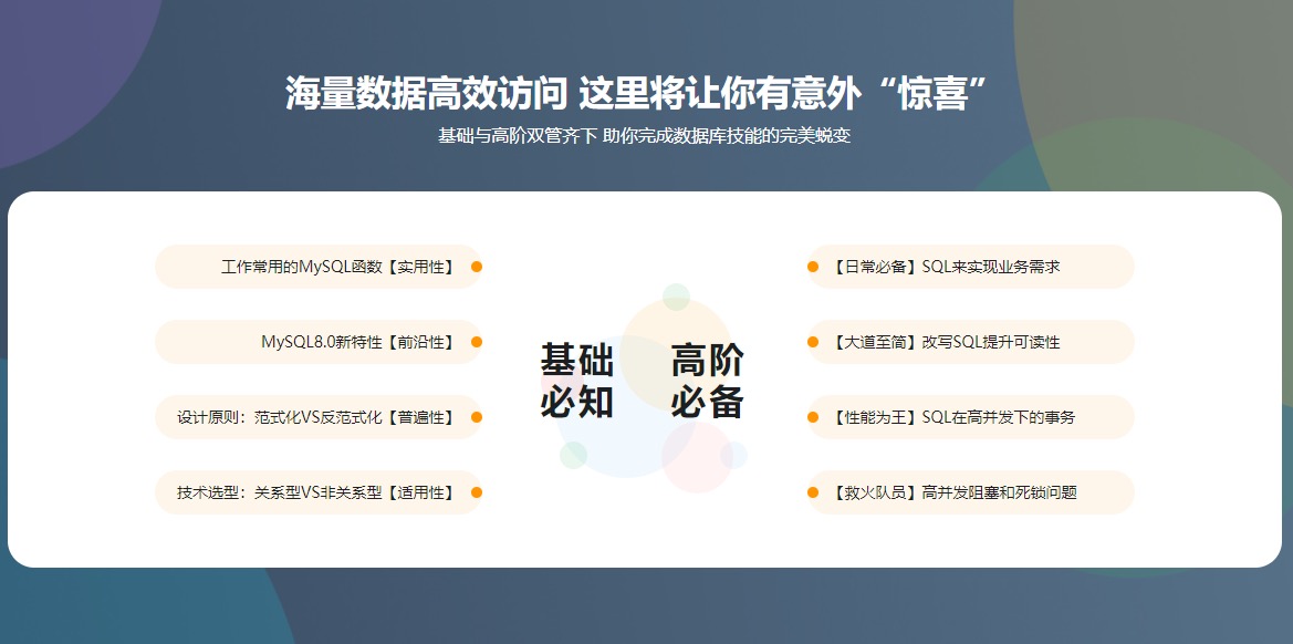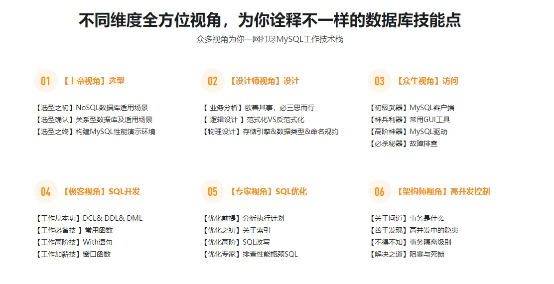 本课程遵循“用户体验至上”的原则,不敢说设计精良,尽善尽美,却也竭尽全力去锻造良好的学习体验。包含三方面,(1)设计之初:遵循“有教无类,教学相长”的原则;(2)学习路线:采用循序渐进的教学模式,带你从了解到熟悉,到掌握,到精通,最后到深谙;(3)学习内容:课程遵循前沿性,以当前最新企业主流的MySQL8.0版本为内容。以“实用”为课程最高宗旨,带你搞定工作中SQL优化 痛点问题,最终的目的是:助力个人能力的快速提升,最终服务工作所需,助你占据不可替代的一席之地。