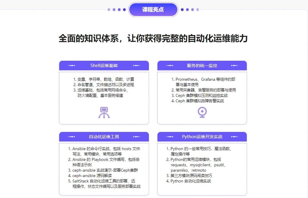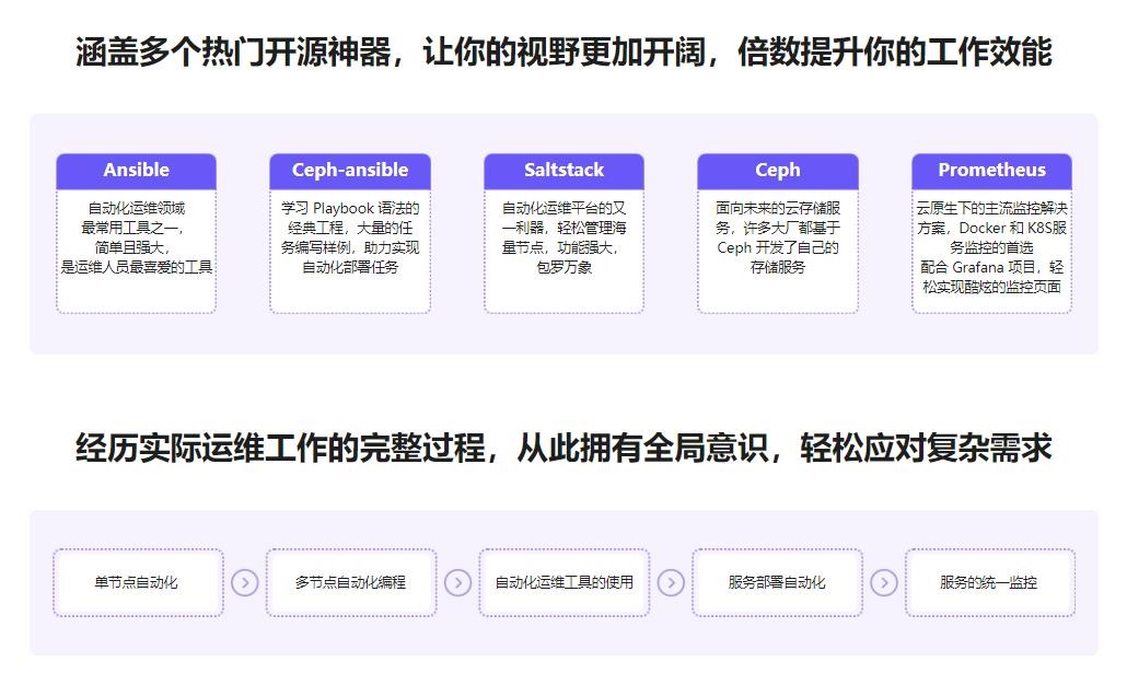 自动化运维已经成为大中厂的主流,为了解决大家在运维岗晋升需求,本课将帮你扎实自动化运维的核心基础,提升Shell,python脚本编写能力,精通主流自动化运维工具的使用,驾驭自动化运维工作全流程。助你突破薪资的局限和技能的瓶颈,轻松步入自动化运维岗。