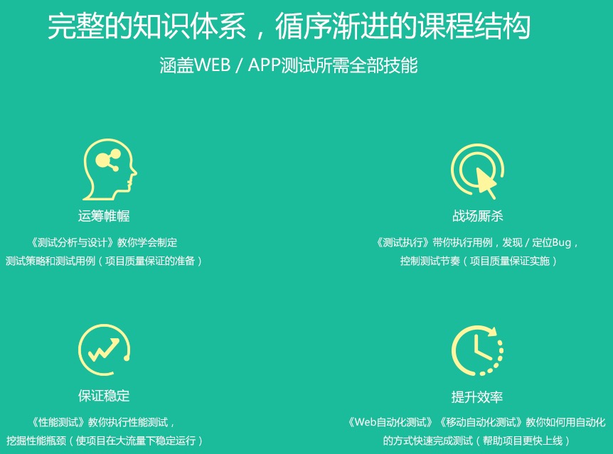 网易云音乐、邮箱大师、考拉海购一线产品测试专家联手打造,聚焦测试工程师必备技能,从测试分析到APP/WEB测试执行、从APP/WEB自动化测试到高并发性能测试,助你成为一名优秀的测试人。