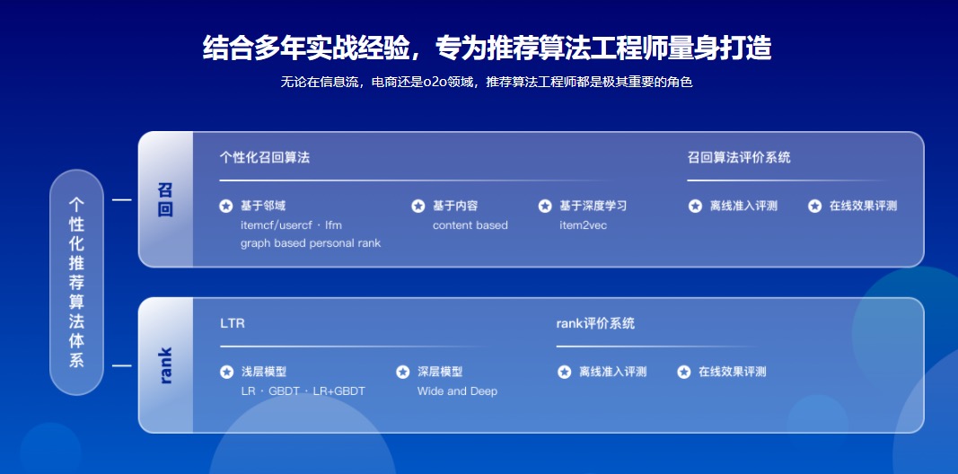 推荐算法工程师已成为各个大厂炙手可热的岗位,社招起步薪资20k+!本课程,讲师从算法原理到代码实战,细致的讲解个性化推荐算法如何在开发中落地,让你可以建立起自己的推荐算法体系。同时也可以让你掌握算法公式,模型参数迭代等技术的微小细节。
