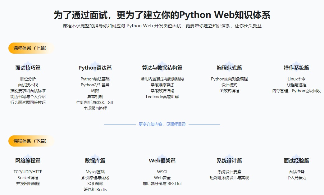 Python服务端工程师学什么,面试问什么,你该准备什么?别苦恼,别害怕,别纠结,这门课程带你系统梳理面试知识,增加面试成功几率,提升后端开发技能,在面试之前解决你的各种问题,让你技术实力和面试技巧得到双重提升。