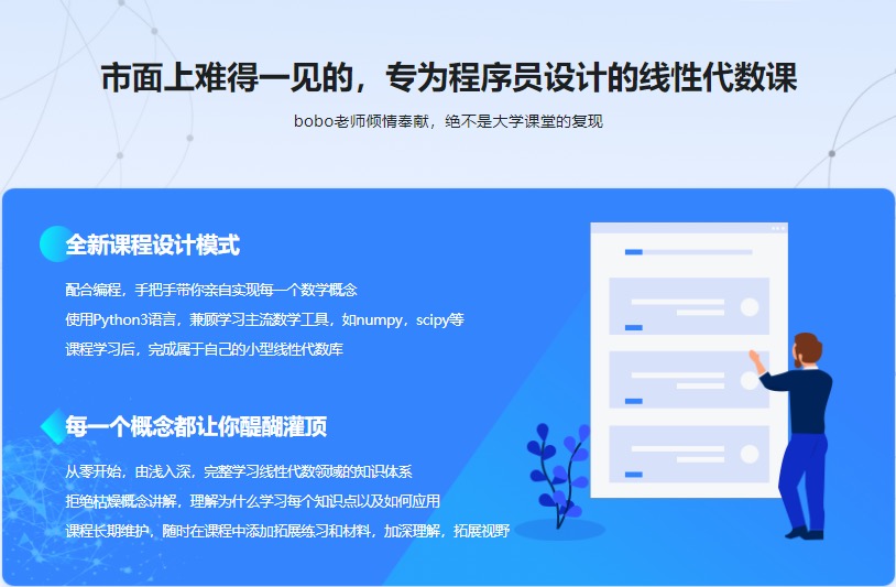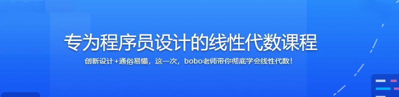 bobo老师专为程序员规划的线性代数课程,全新的课程规划模式,配合编程讲解,回绝单调的例题讲解,而是讲清楚每一个常识点的来龙去脉,完好学习线性代数领域的常识系统,这一次,让你学会线性代数!