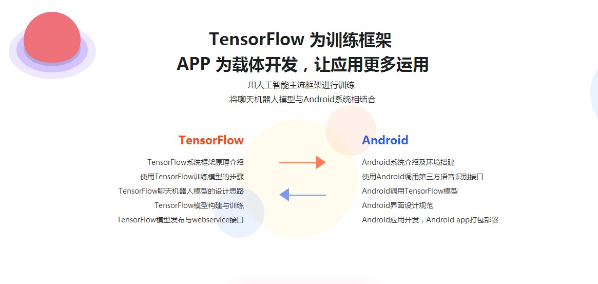 介绍tensorflow的基础知识和原理,介绍tensorflow的基本训练方法和训练的注意点,介绍什么是Android系统及Android系统的四大基本组件,以及如何开发Android APP,开发工具用什么,环境如何搭建。