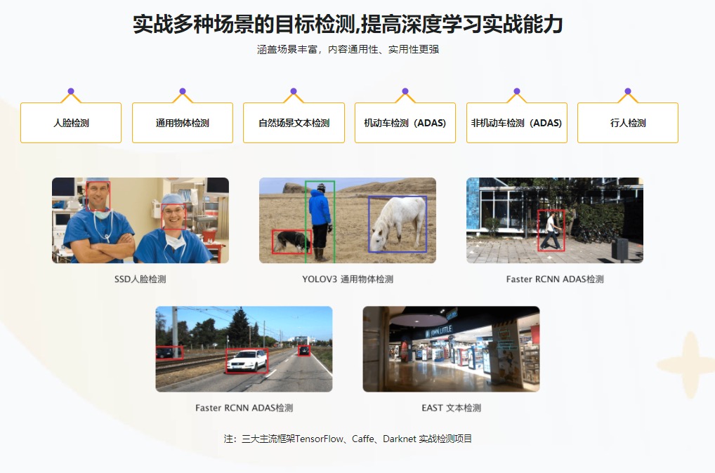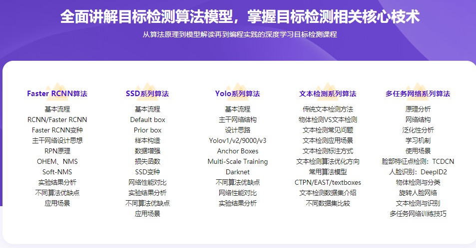 课程从算法角度出发,对各个模型进行全面细致的讲解,并结合人脸检测、物体检测、行人车辆检测、文本检测等项目,熟悉算法工程师在工作中会接触到的数据打包、网络训练、测试等问题,一步步带大家了解和完成目标检测实战案例,尽快进入深度学习领域。
