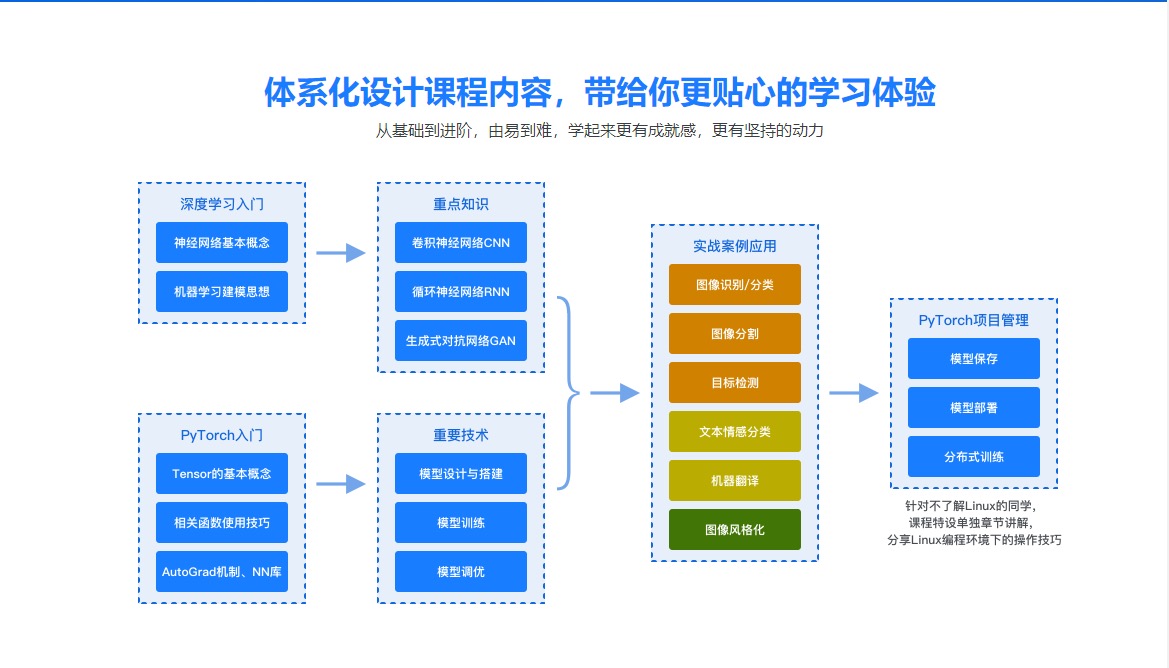 本章节主要介绍课程的主要内容、核心知识点、课程涉及到的应用案例、深度学习算法设计通用流程、适应人群、学习本门课程的前置条件、学习后达到的效果等,帮助大家从整体上了解本门课程的整体脉络。