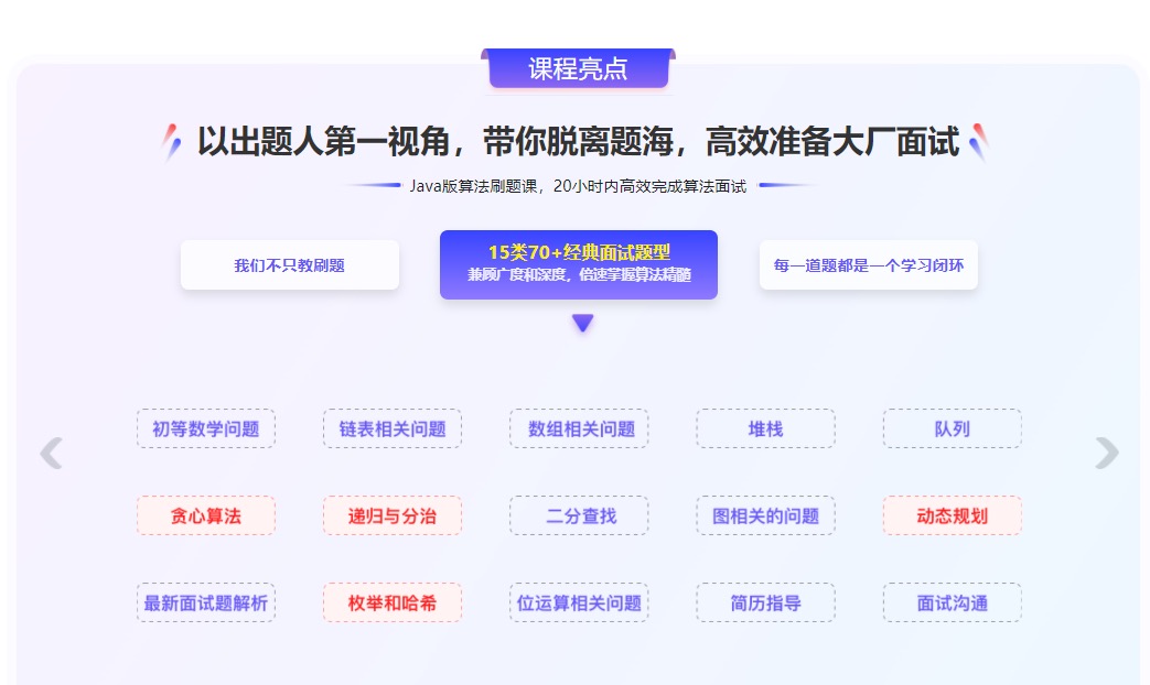 本套课程不讲算法基础知识,专攻算法题解。讲师作为诸多算法练习相关网站出题人,拥有多年出题及面试经验,将大厂主流经典的面试题全面归类梳理,带你掌握高效解题思路,摆脱题海,举一反三,只需20小时,完成面试准备。