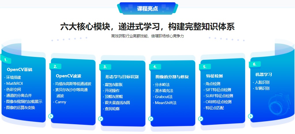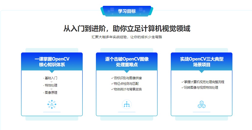 人脸识别、自动驾驶、物体检测……想进军未来高科技行业,OpenCV是基石。本课程带你系统掌握计算机视觉核心知识体系,突破OpenCV重难点,真实落地“车辆检测、文字识别、图像拼接” 三大典型项目,高效积累计算机视觉实战经验与能力。