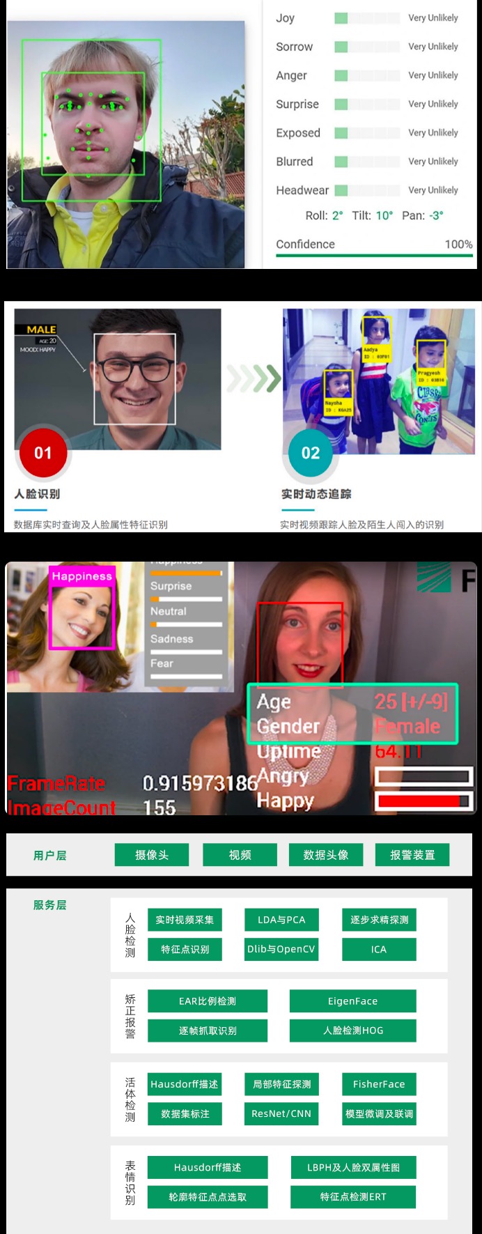本项目可通过摄像头实时采集视频人脸数据,也可批量图片输入自动化识别人脸;本项目对视频可实现人脸的跟踪,并标注姓名、性别、情绪(开心、生气、自然)等信息并能对进入视频的陌生人报警,通过对人眼状态的监测对疲劳驾驶发出警报,并能通过对深度神经网络的训练,进行活体检测。