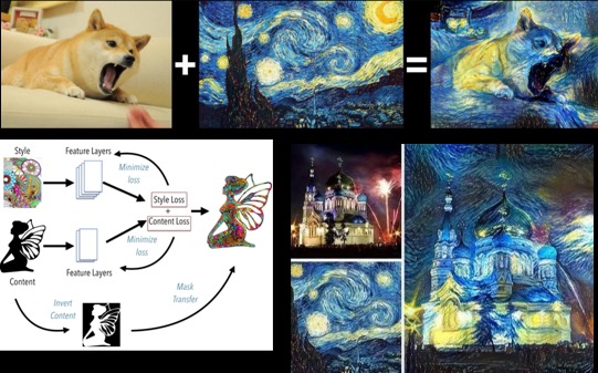 例如建筑物变化为梵高风格,狗狗变成梵高风格图片等,都是基于深度神经网络自动生成。