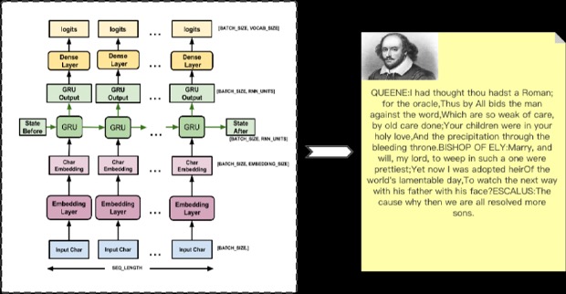 输入为任意文本,循环输出指定长度的莎士比亚风格的文本。以莎士比亚的剧作为训练样本,使用GRU模型直接生成概率分布,通过random categorical进行结果选择,找到最有可能的生成方案。