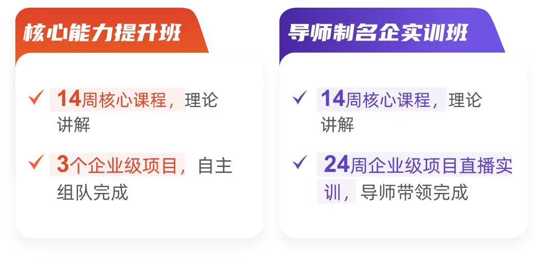 三个方向的课程持续时间为4~6个月,分为两个班型: