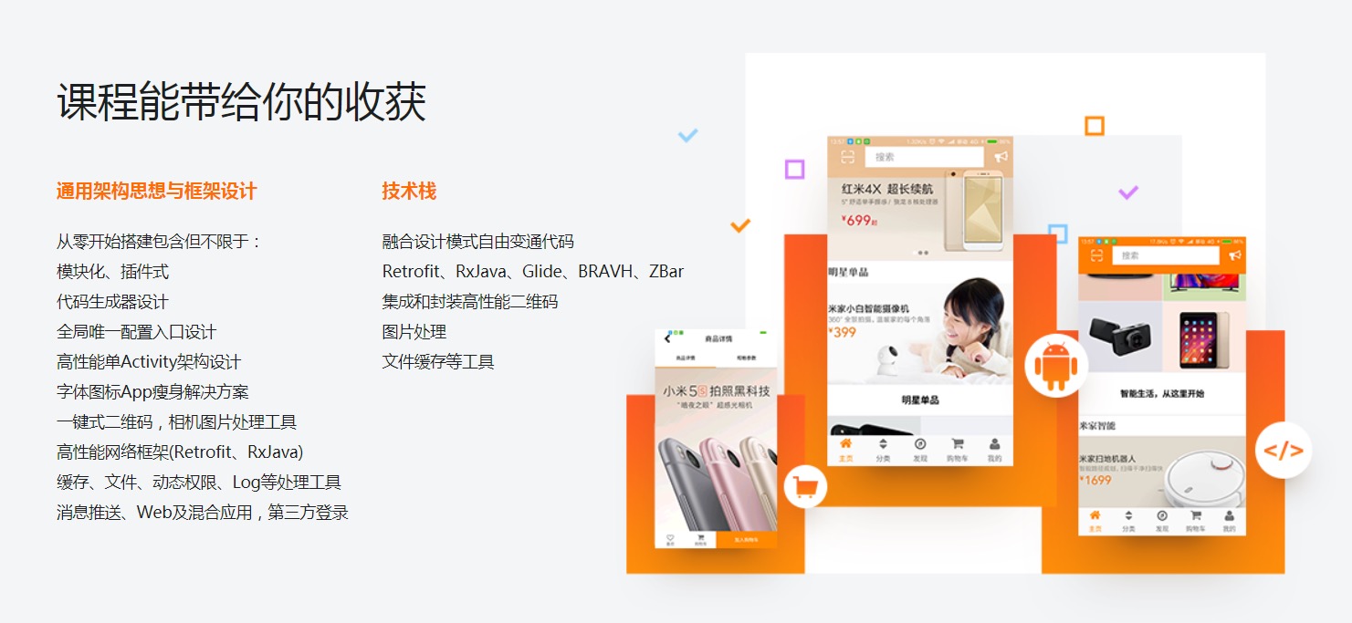 - 第1章 课程介绍及APP效果展示(Java版)本章概述了本课程大家能学到什么,老师如何讲解,为什么这么讲解,并介绍了框架的整体架构设计与模块分解,最后展示了用自己设计的框架开发出来的完整电商APP的效果图