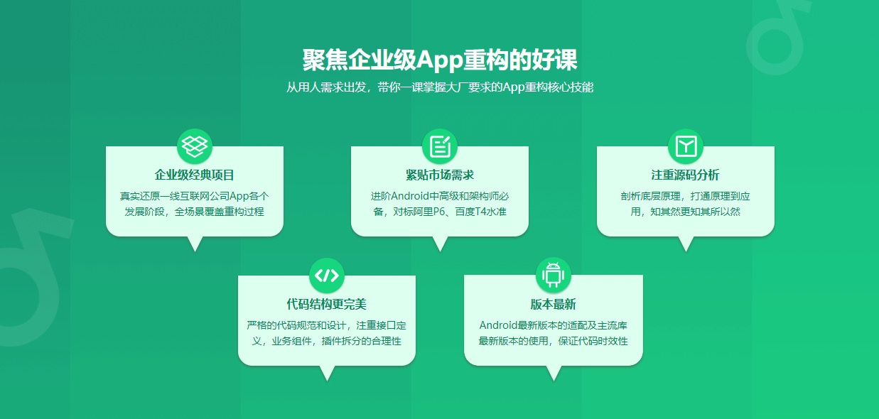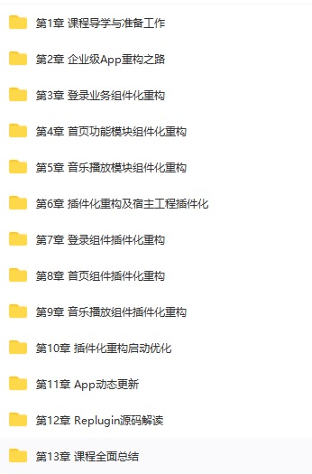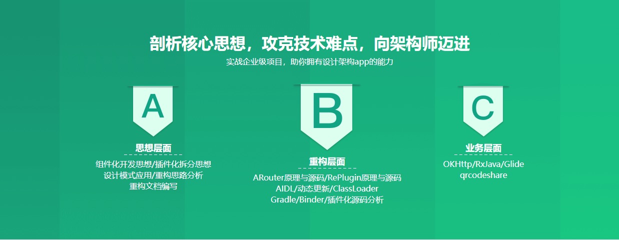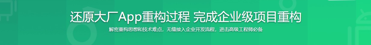 本课程还原一线互联网公司App所经历的重构过程,基于模块化,以组件化重构和插件化重构为核心,让大家掌握一线互联网公司App的最新架构和技术,并且能够解决重构过程中碰到的所有难题。