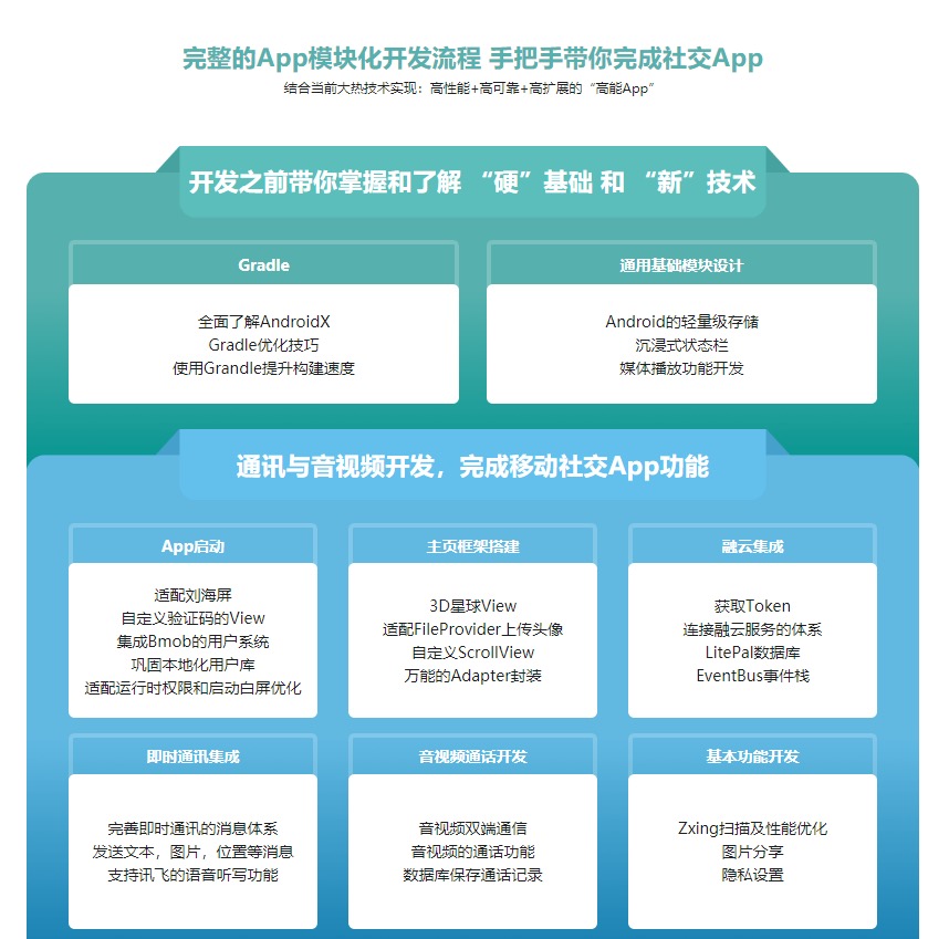 本课程带你从零开始打造一款高性能的社交App,App的框架高仿时下流行的新生代社交 App。课程基于后端云数据库设计用户系统,基于用户关系实现即时通讯和音视频通话功能,并以Google最新的技术规范为UI铺垫,通过课程不仅可以学习到一个完整的社交App从设计到实现的完整开发流程,还能深入思考如何构建通讯层,以及音视频聊天框架,并且带你掌握如何从内存,布局、加固混淆等多方面来提升App性能及安全。