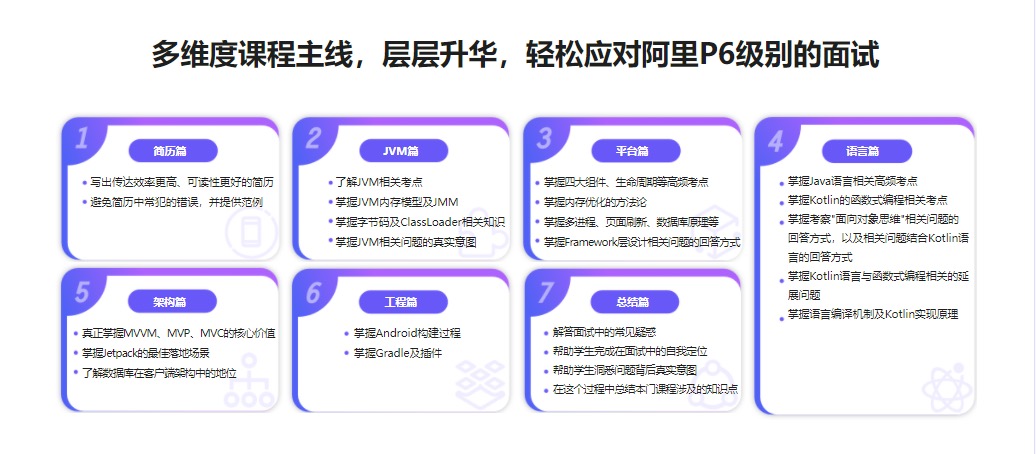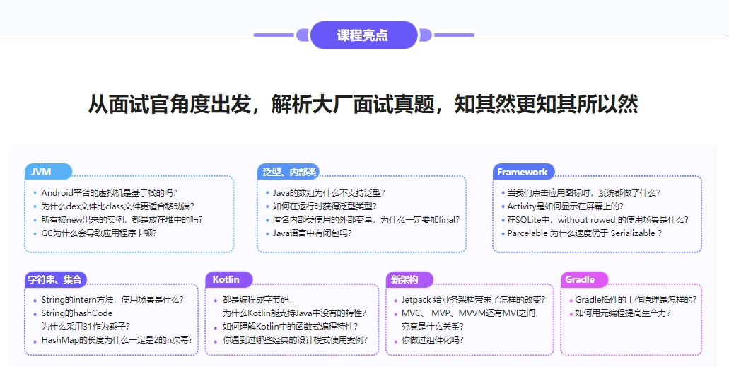 随着Android技术体系的发展,对移动端开发人员需求也在求新求变。本课程由大厂资深面试官带你解析Android面试中各种刁钻问题,从技术栈到业务场景,洞悉面试官真实意图,直击你的面试痛点!大大提升面试成功率的同时,更能提升技术实力,轻松达到阿里P6及以上级别面试标准!
