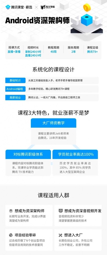 本课程是移动互联网高级开发正式课VIP课程-码牛学院【第二期】,系统化的课程设计从高工的基础技能入手,老师手把手推导底层原理,多年教学经验,精心研发腾讯T9+课程,腾讯认证,一线大厂内推,开启高级工程师之旅。