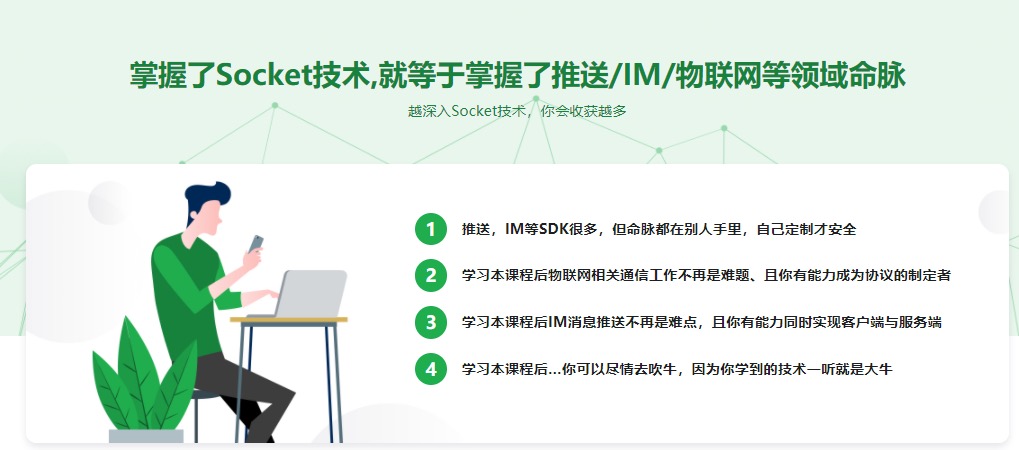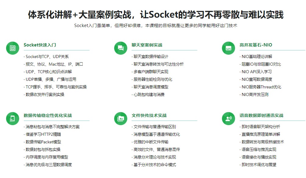 本课程将理论结合实践,带你从零开始,系统学习Socket编程技术,让Socket的学习不再那么零散与难以掌握,同时会提炼出Socket网络传输的核心思想与构架,并带你踩坑出坑,增加你的分析与处理问题的能力,完善你的编程思想与知识体系。