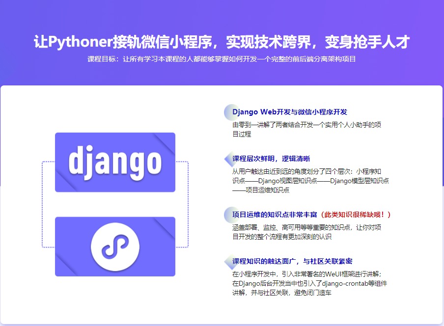 BAT大牛亲授,从零到一的完整项目开发实战过程,项目开发聚焦重要知识点,先原理后实战!项目代码注重质量,书写规范。更有稀缺服务监控,项目部署,服务容灾高可用内容,是一次难得的Django+小程序全栈项目体验。