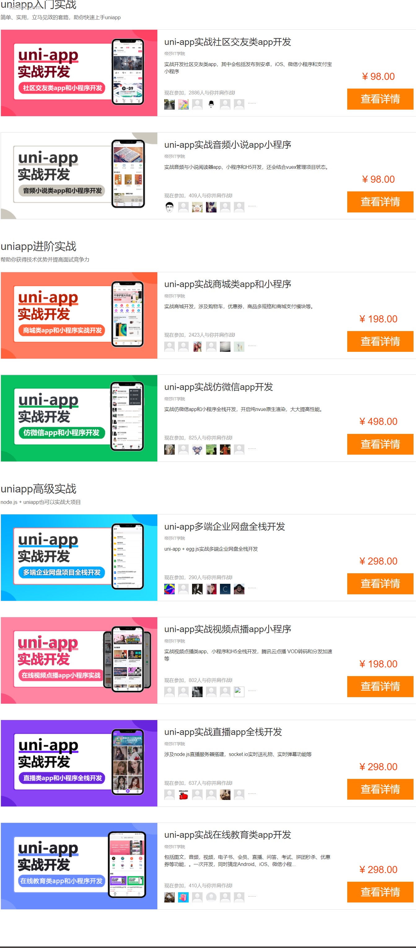 全网最详细的uniapp实战开发app小程序教程,7大实战开发案例(社区交友,商城,即时通讯,音频小说、网盘、点播、直播)帮助你获得技术优势并提高面试竞争力。