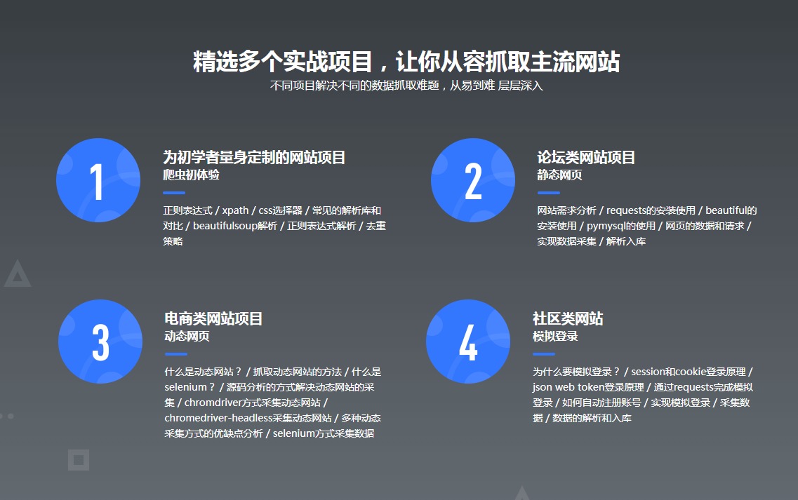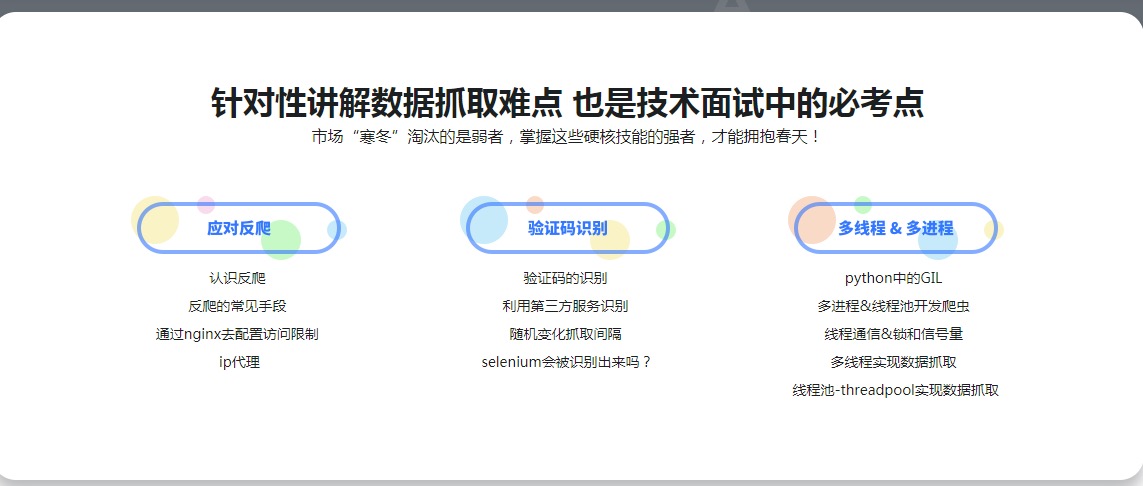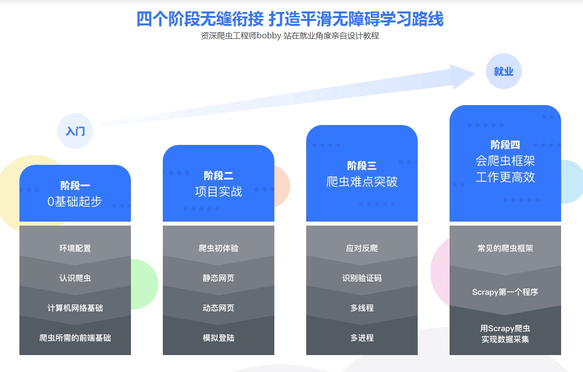 大数据时代,python爬虫工程师人才猛增,本课程专为爬虫工程师打造,课程有四个阶段,爬虫0基础入门->项目实战->爬虫难点突破->scrapy框架快速抓取,带你系统学习。课程精选多个实战项目,从易到难,层层深入。不同项目解决不同的抓取问题,带你从容抓取主流网站,进阶部分针对性讲解数据抓取的难点和面试考点,让你牢牢掌握爬虫工程师硬核技能。