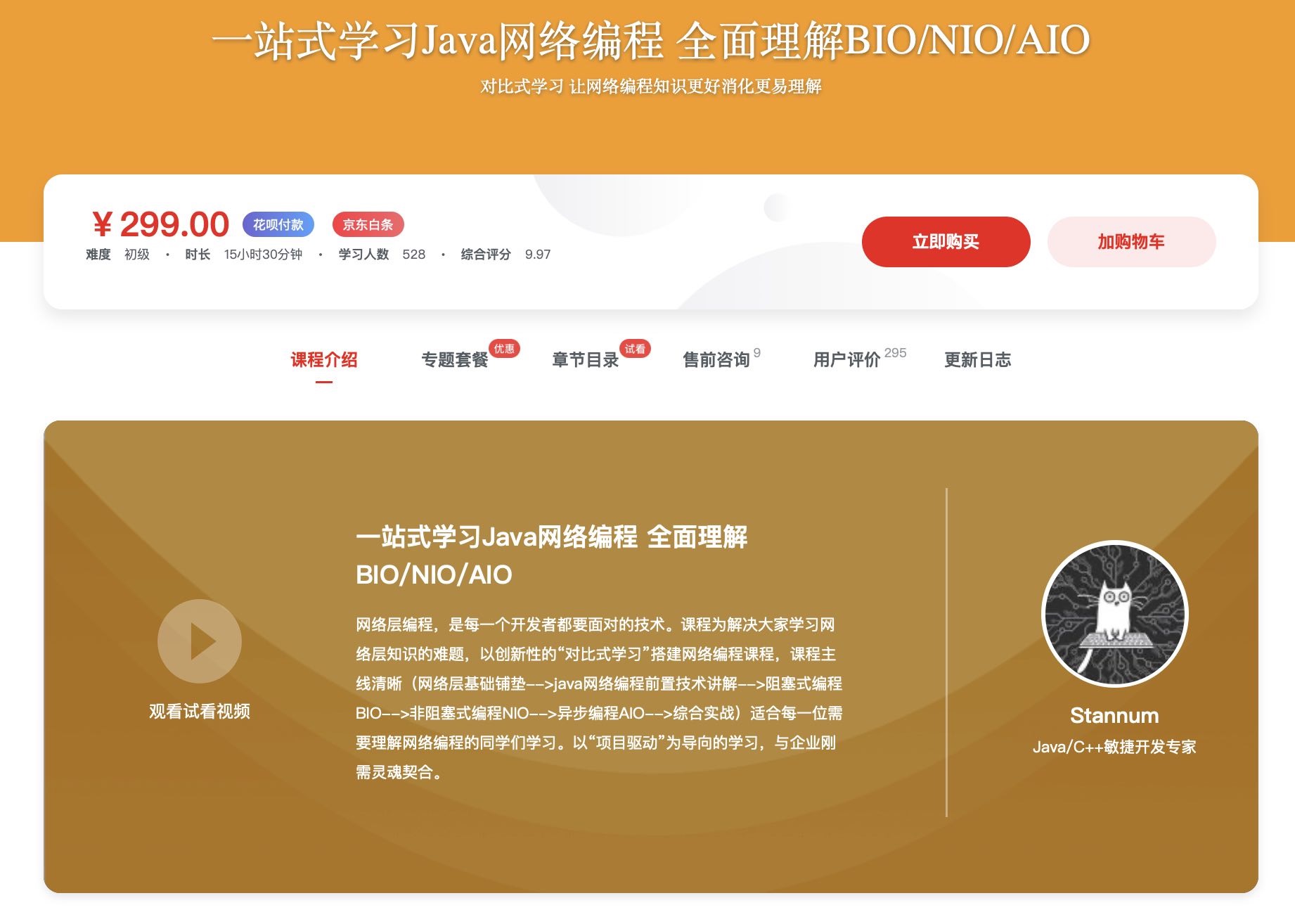 以创新性的“对比式学习”搭建网络编程课程,课程主线:网络层基础铺垫–>java网络编程前置技术讲解–>阻塞式编程BIO–>非阻塞式编程NIO–>异步编程AIO–>综合实战)适合每一位需要理解网络编程的同学们学习。