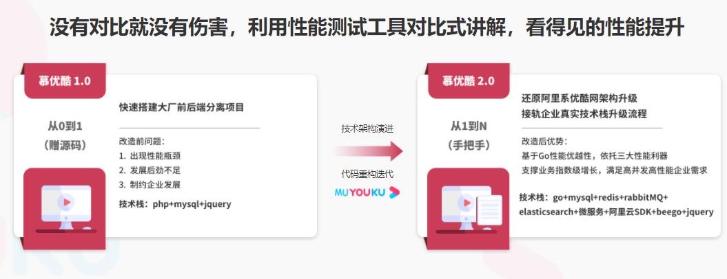本课以 “优酷网”为蓝本 ,基于PHP构建“慕优酷网”, 后进行Go改造。从1到N的Go改造踩坑避坑点,掌握三大性能利器:Redis、RabbitMQ、Elasticsearch。还原真实项目架构演进、代码重构迭代过程。