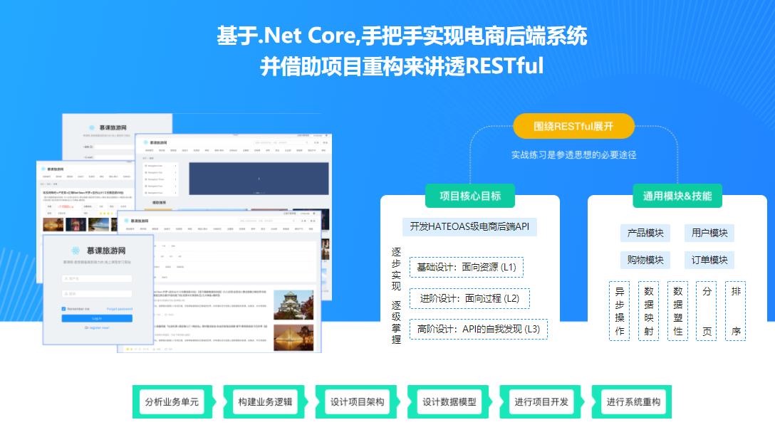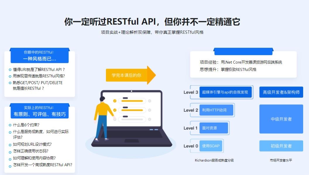 使用RESTful风格构建企业级应用已经是行业共识,课程采用.Net Core框架通过开发“旅游网”项目,带领大家吃透RESTful思想,真正掌握高成熟度(HATEOAS超媒体引擎)级别RESTful API的开发技能。
