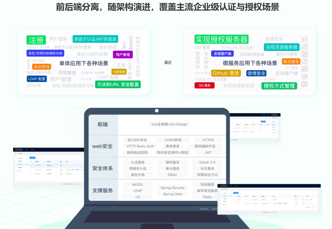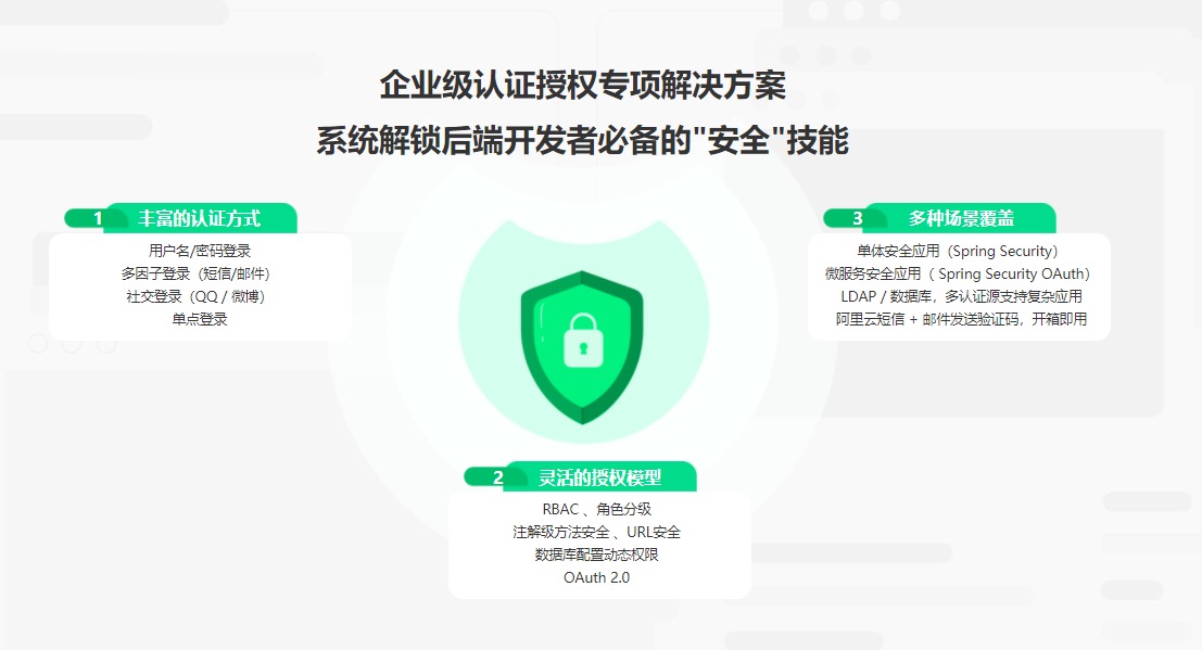 证与授权是所有应用都必须要实现的,也是所有后端工程师必备的技能,本课将结合前后端分离的权限管理应用,基于从单体到微服务的演进,精讲主流安全框架 Spring Security5.x 的核心技术,一站式覆盖目前企业主流认证授权的方方面面。