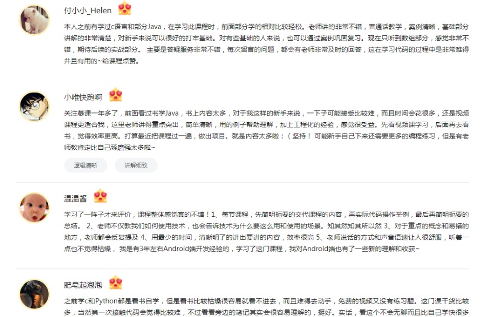 学习了一阵子才来评价,课程整体感觉真的不错!1、每节课程,先简明扼要的交代课程的内容,再实际代码操作举例,最后再简明扼要的总结。 2、老师不仅教我们如何使用技术,也会告诉技术为什么要这么用和使用的场景。知其然知其所以然 3、对于重点的概念和易错的地方,老师都会反复提及 4、用最少的时间,清晰明了的讲出要讲的内容,效率很高 5、老师说话的方式和声音语速让人很舒服,听着一点也不觉得枯燥, 我是有3年左右Android端开发经验的,学习了这门课程,我对Android端也有了一些新的理解和收获~