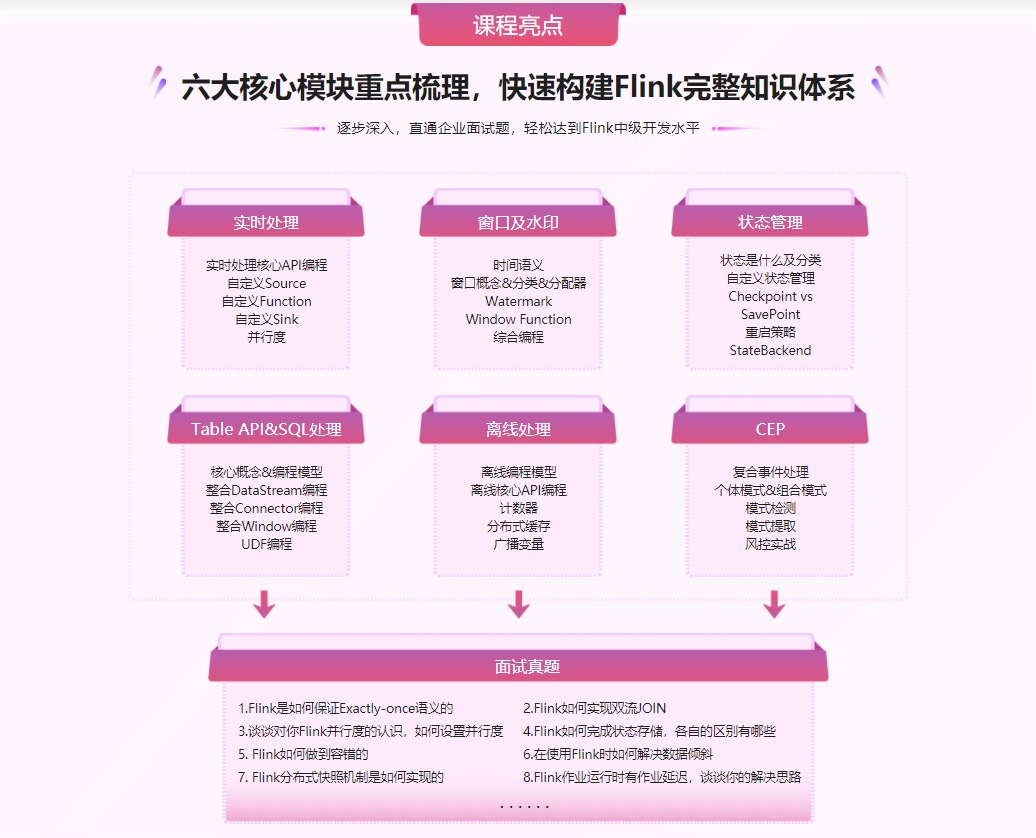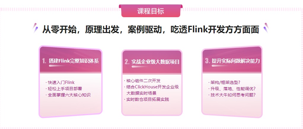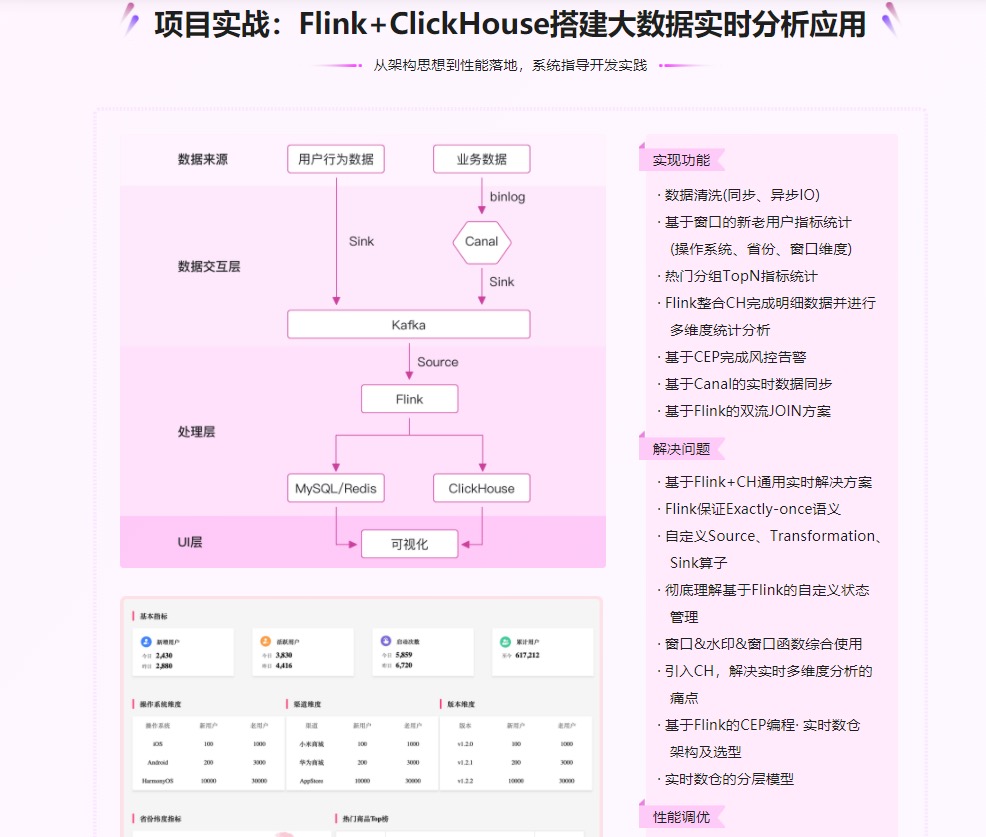 Flink已经成为高薪大数据工程师的必备技能,越早掌握,越能占得红利。本课程带你原理出发,构建知识体系,并引入热门OLAP引擎ClickHouse,整合Flink搭建企业级大数据实时分析应用,带你彻底打通Flink开发任督二脉。