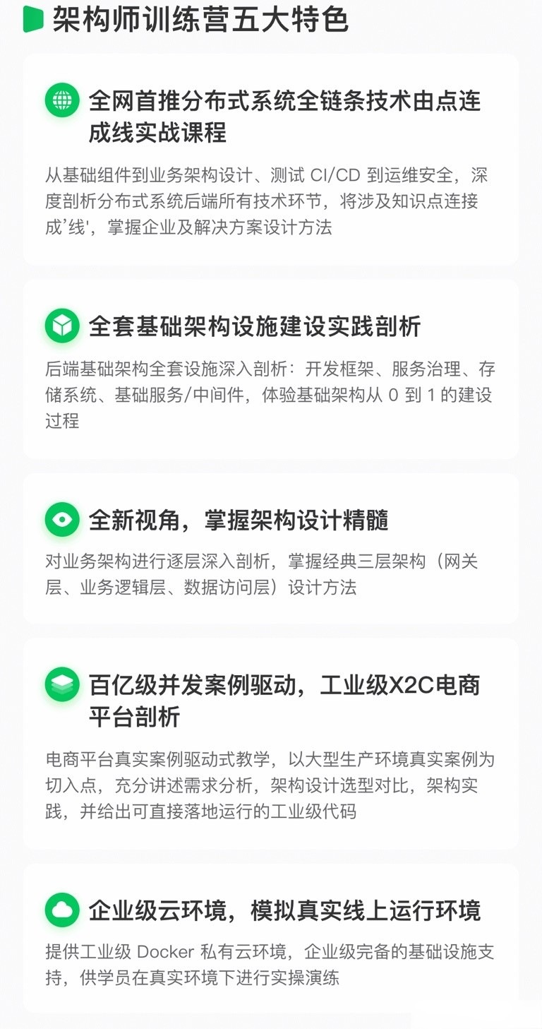 课程由一线大厂资深架构师(阿里 P8+)进行主讲。业内首次将分布式架构全部技术点串联,并结合大厂真实案例实践讲解,将后端架构技术全面系统的展现,帮助同学们从全局视角掌握分布式架构设计方法,成为一名合格的架构师。他们用名师+好课来改变世界,打破业界严重缺乏顶层架构思维且仅靠疯狂堆叠知识点常见做法,初心不变,让每个人持续提升职业能力!让每个程序人获得抵御寒冬的能力! 耗时数个月,老师经历了数十个通宵的奋战,终于将这款《架构师训练营》课程打造出来。