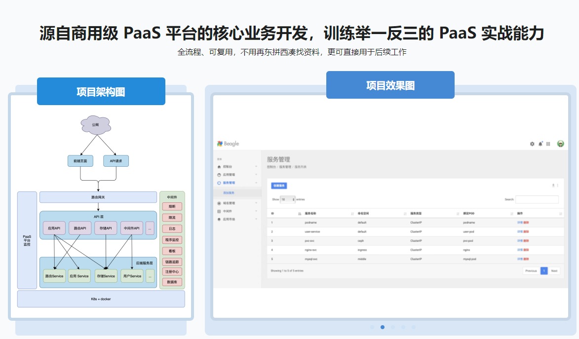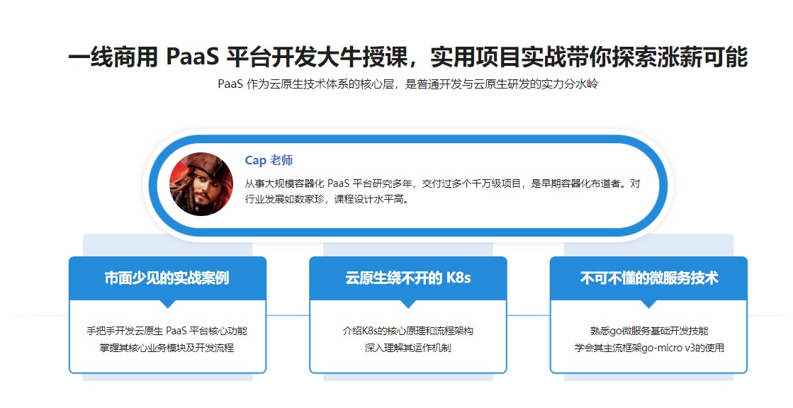 云原生已是毋庸置疑的技术发展趋势之一。PaaS作为云原生体系的核心架构层,正被越来越多的公司应用,PaaS工程师也成为企业招聘热门资源。Go开发者,正是PaaS工程师的主要人才来源。本课程将带领大家,结合Go微服务打造PaaS平台的核心业务(包括Pod,service,deplyment,Ingress,存储,监控,中间件,镜像市场等),帮助Go工程师探索PaaS开发,挖掘职业新可能。