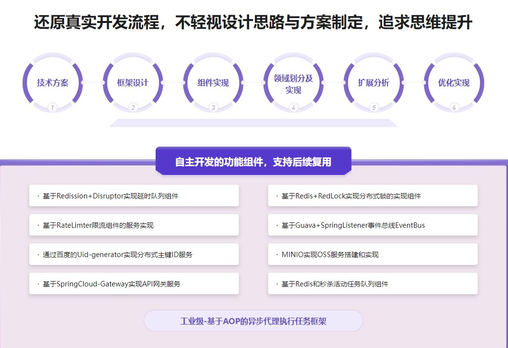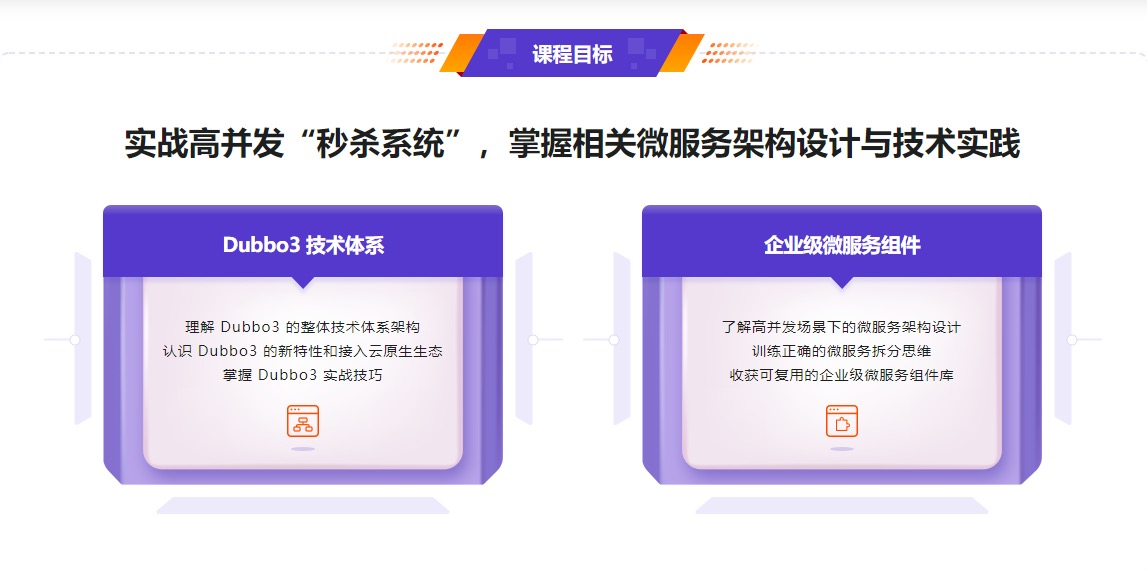 基于 Dubbo3 实战高并发“秒杀购物系统”Dubbo3 作为极具潜力的云原生 RPC 框架,是面向高并发场景进行微服务开发时的好帮手。本课程用秒杀购物商城项目贯穿,基于 Dubbo3 与其他流行的组件组合实践,完成微服务架构方案设计及落地,帮助大家训练微服务设计思路并掌握 Dubbo3 相关开发技能。