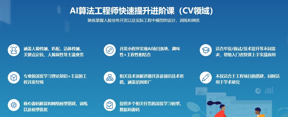 伴随着人工智能技术的发展,深度学习技术变得越来越热门,越来越多的人选择转行做深度学习算法工程师。本课程围绕人脸相关技术,展开多个模型的教学,涉及人脸检测、人脸匹配、人脸关键点定位等基础研究技术,最终搭建一个人脸智能小程序,完成整个项目的实战应用,最终可以达到算法工程师的初步要求。