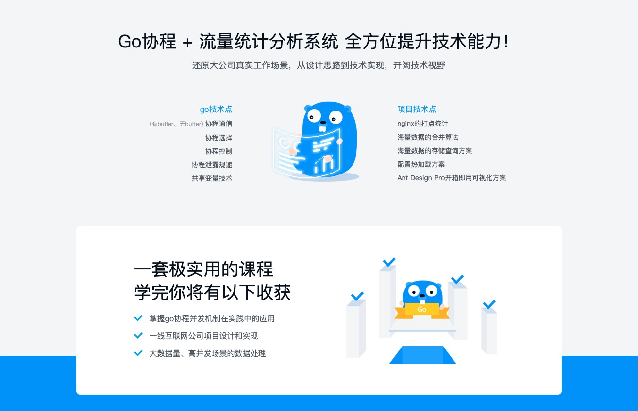 不使用繁琐的锁,不使用共享变量,不使用等待机制,如何高效、更简单的完成并发任务? Go协程机制改变你的三观!本门课程将以日常网站、App应用中的流量统计分析系统为例,讲解如何借助go语言协程的特性来处理高并发场景下的流量分析计数功能,让你对Go协程有一个更完整的理解,同时也可以快速掌握一线互联网公司项目的设计和实现