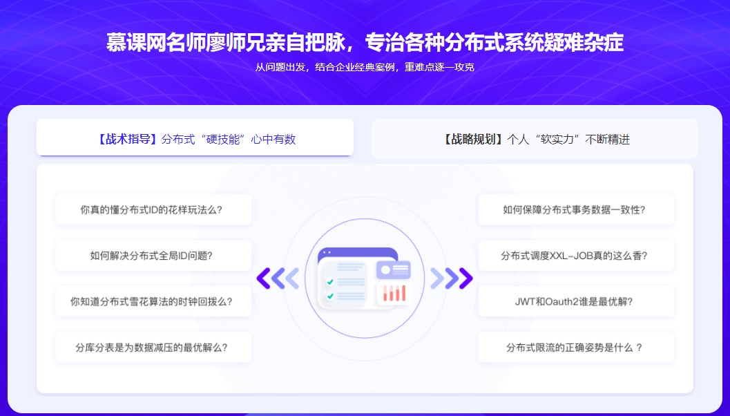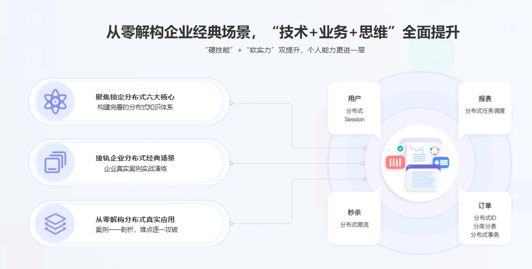 分布式:程序员永恒的命题。课程包含分布式ID、分布式Session、分布式任务调度、分布式限流、分库分表、分布式事务六大专题,案例涵盖用户、报表、秒杀、订单等经典场景,企业常用分布式实战案例&解决方案,完整打包给你!